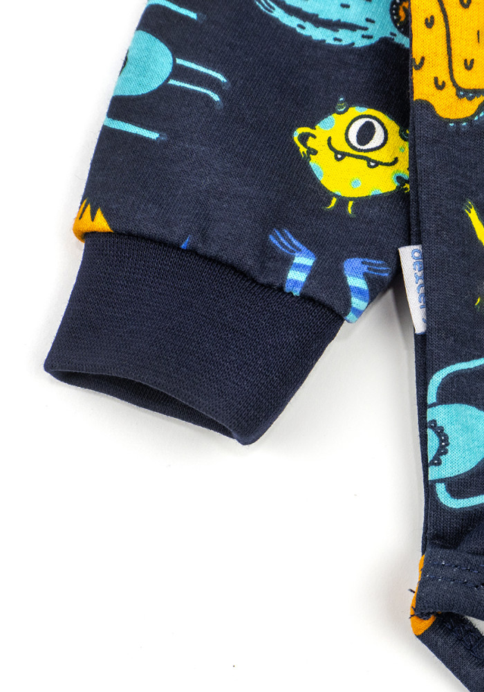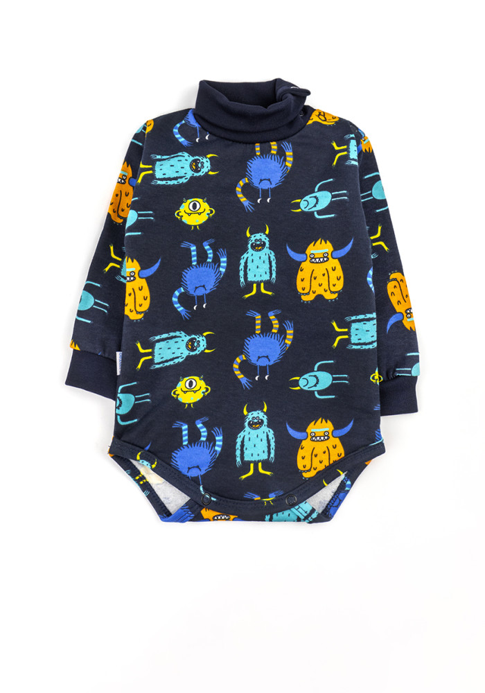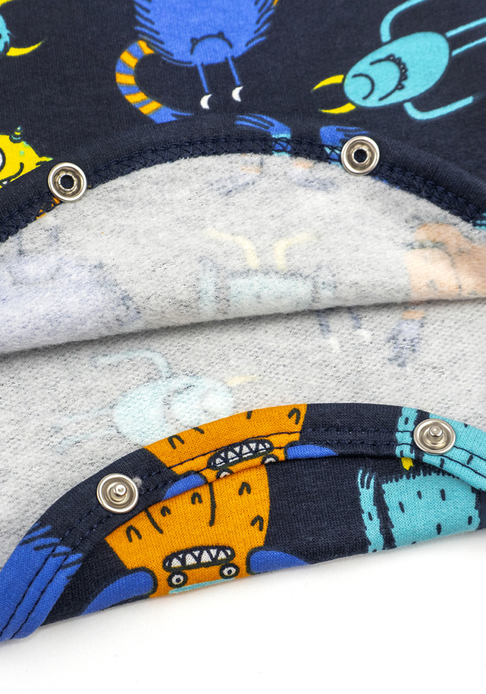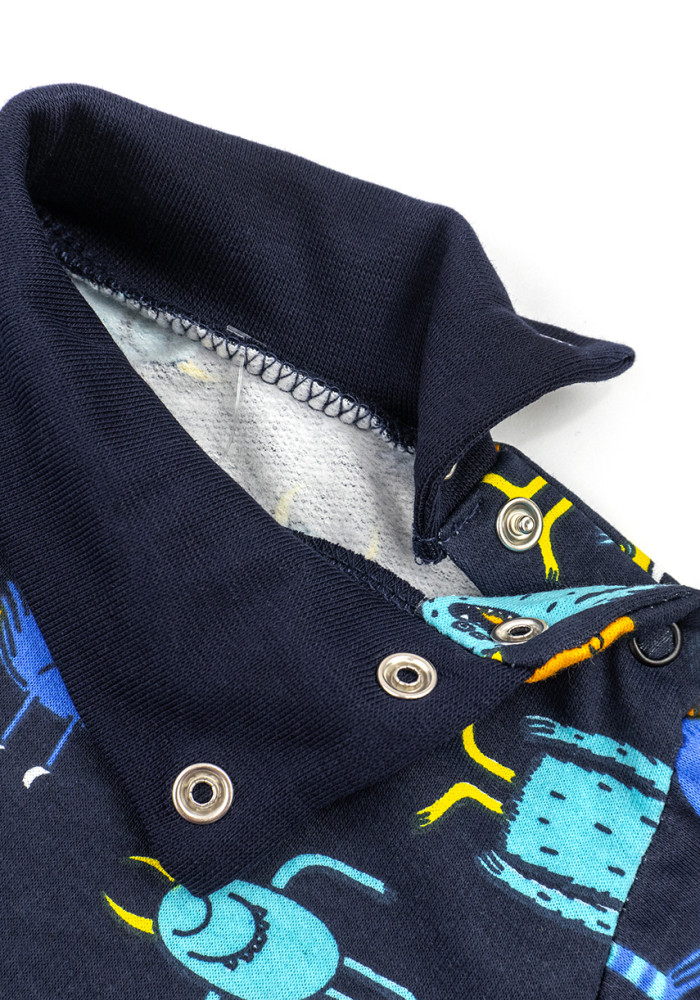 Designed with snap closures at the shoulder and between the legs for easy changing. The blue color with playful monster print makes it a fun and stylish option for baby boys.