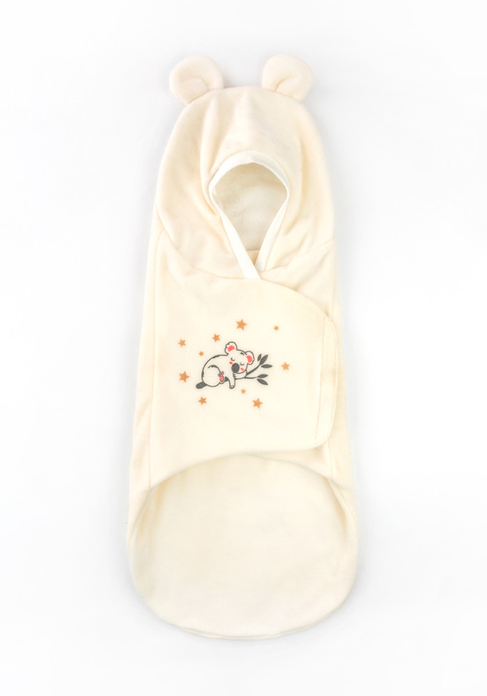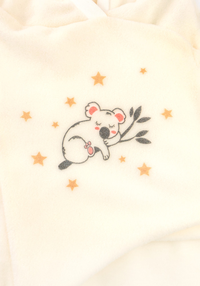 The hood features adorable ears, and the front is decorated with a cute koala print. Fastens easily with a Velcro closure for quick wrapping.