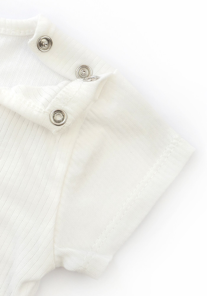 The plain T-shirt features short sleeves and shoulder snap buttons for easy changing.