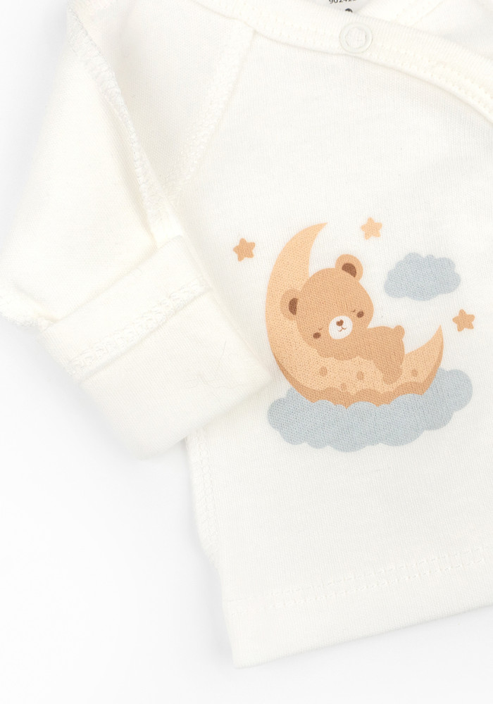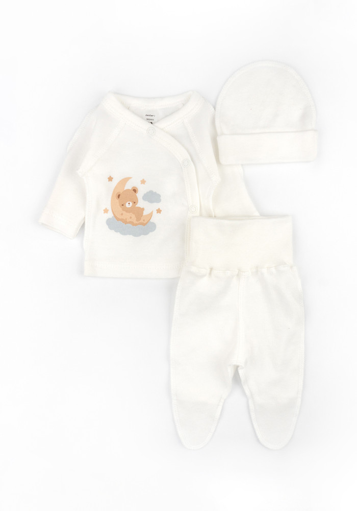 This soft interlock baby set is designed for newborns, premature babies and infants with low birth weight. Made of 100% natural cotton, it provides gentle care and proper thermoregulation from the very first days. The universal cream color with a cute bear print makes the set suitable for both boys and girls, as well as an excellent choice for twins. Perfect for the maternity hospital and everyday home wear.
