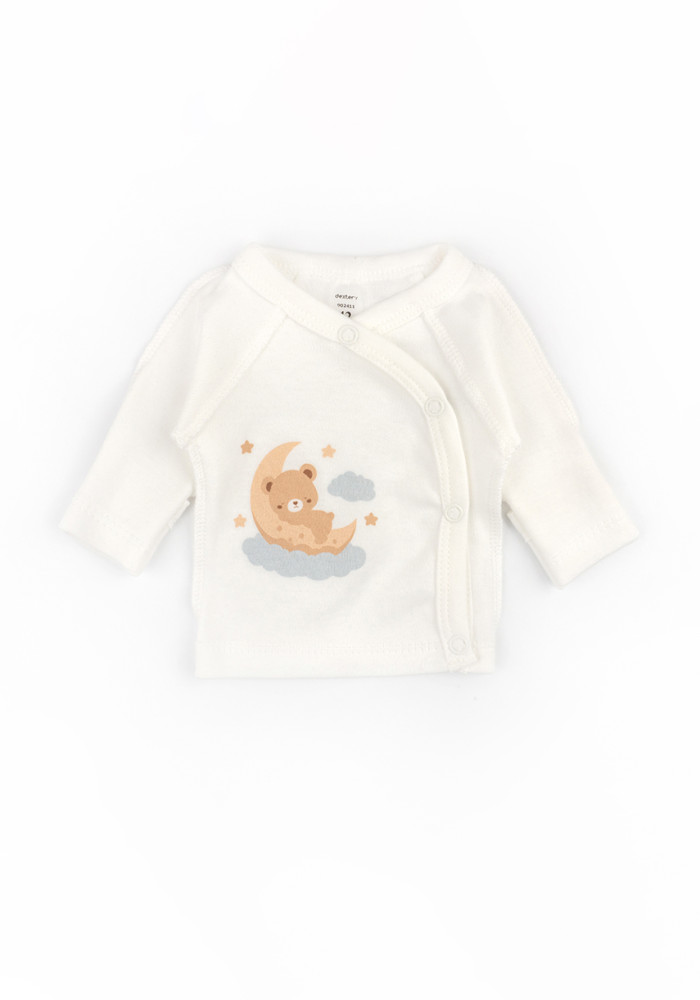 A bear-print shirt with snap buttons and flat external seams for maximum comfort.