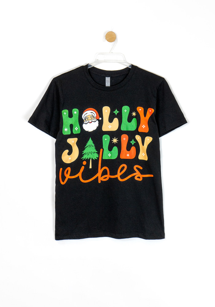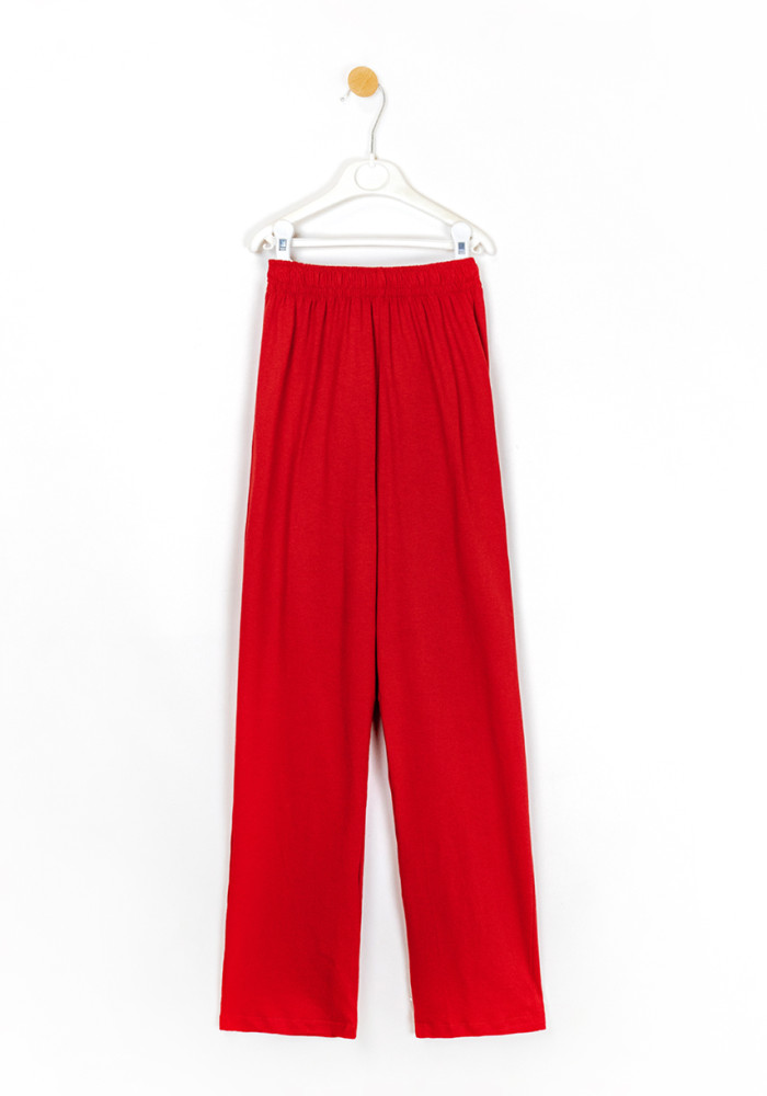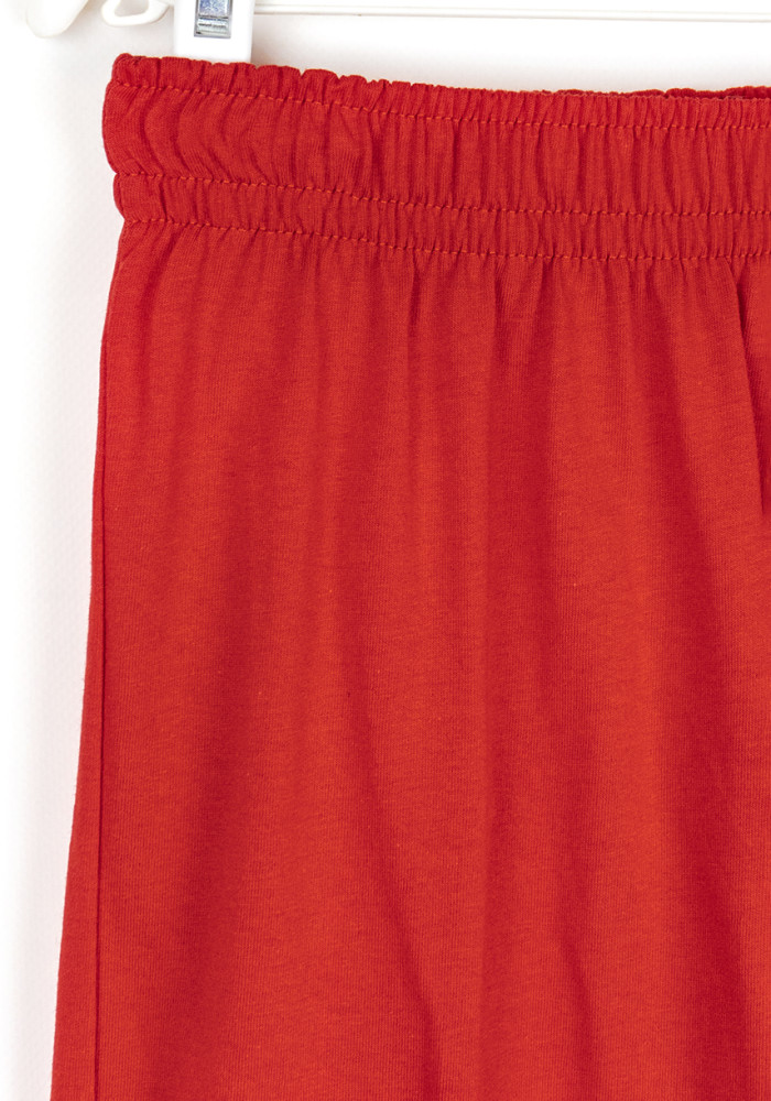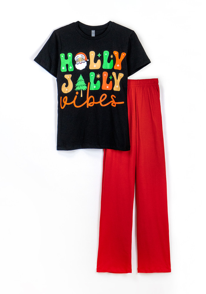 Комплект состоит из чёрной футболки с праздничным принтом и красных брюк прямого кроя. Пижама подойдёт как для сна и отдыха, так и для семейных фотосессий в новогоднем стиле.