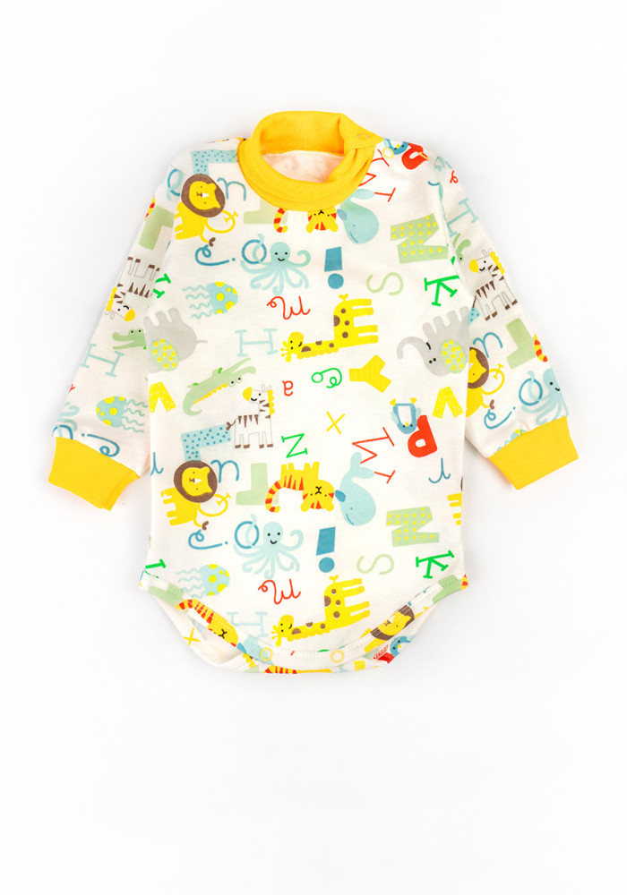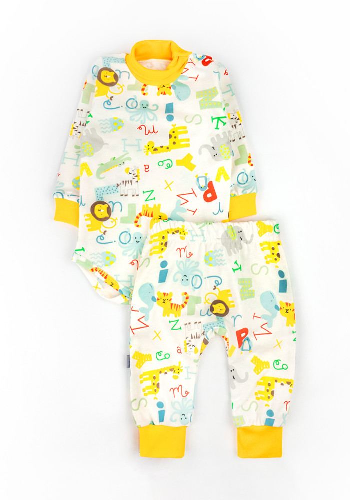 В комплект входят два предмета: боди с высоким горлом и кнопками на плече, а также брюки на мягкой резинке.