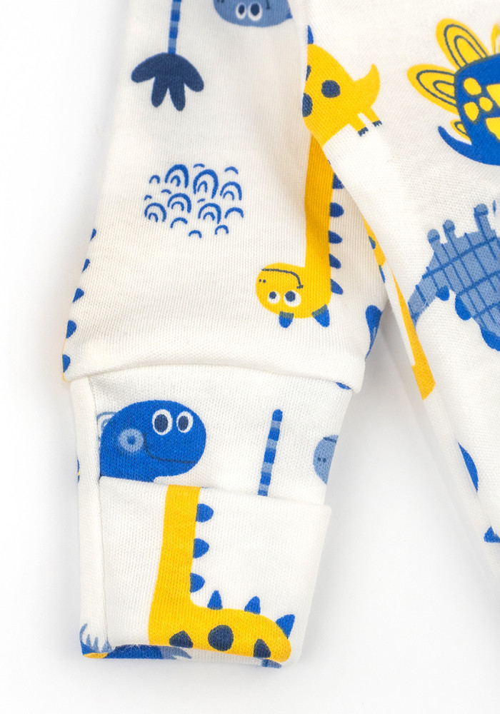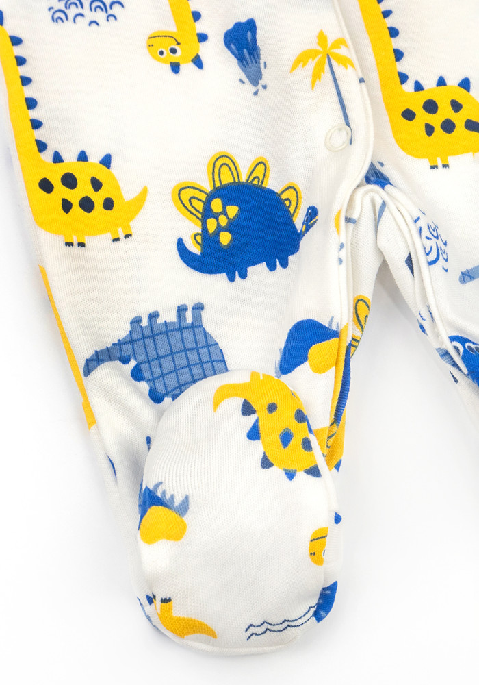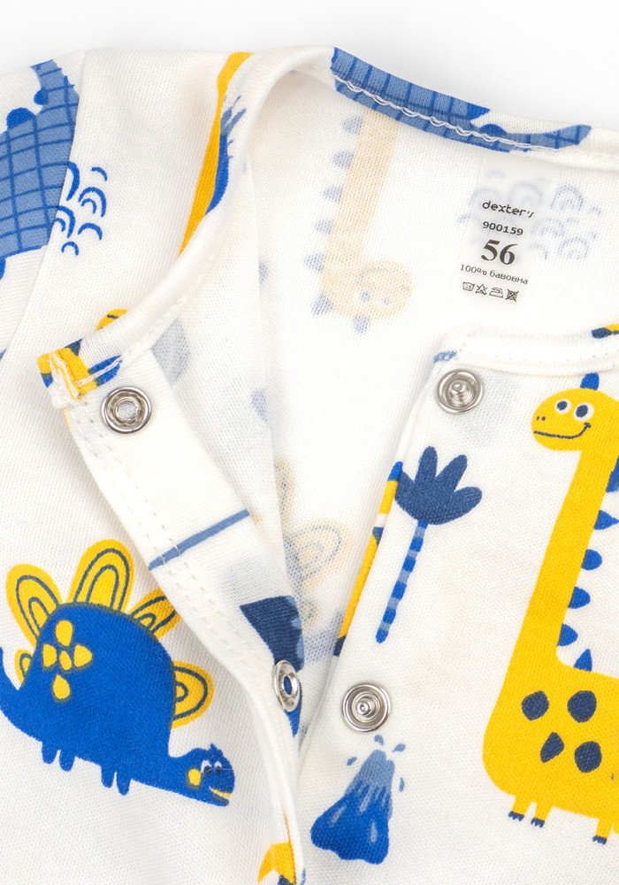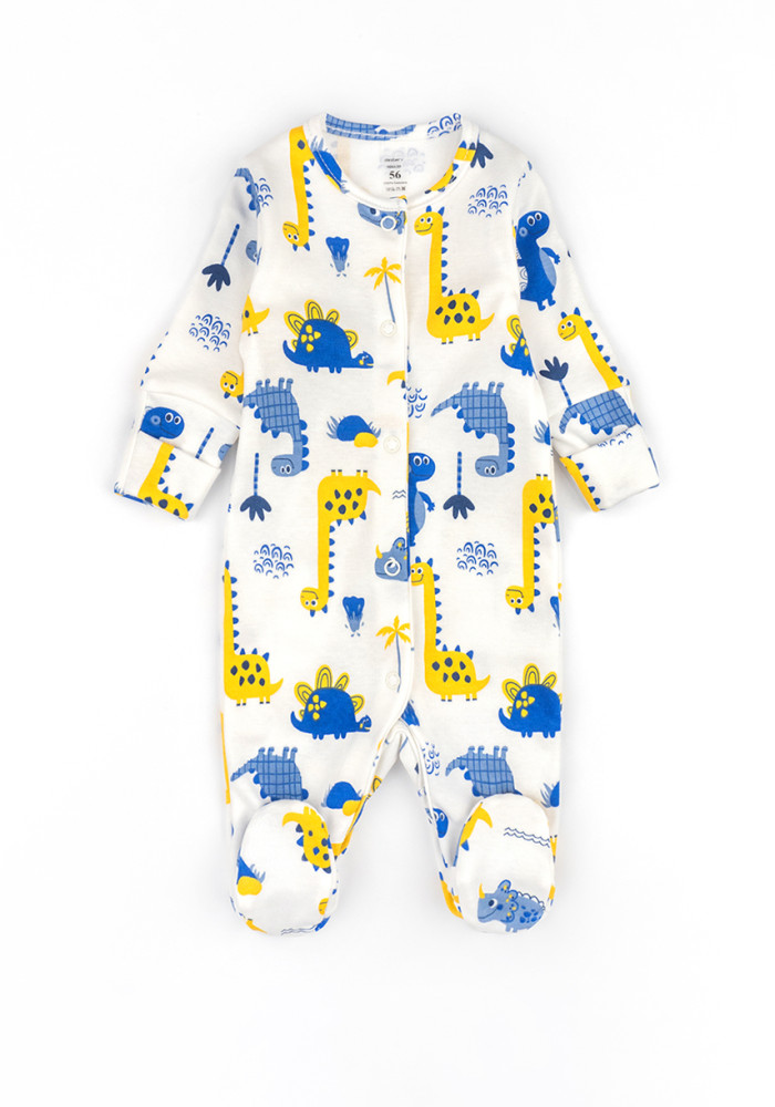 Нежный комбинезон молочного цвета с динозаврами выглядит мило и стильно. Такой детский человечек с принтом динозавров станет отличным вариантом для мальчика.