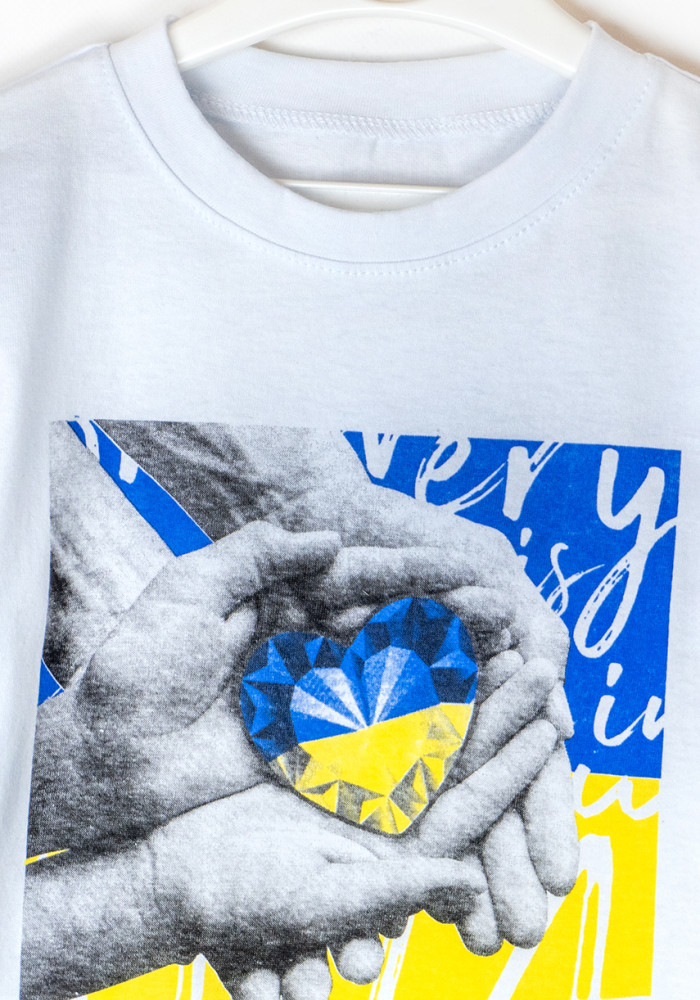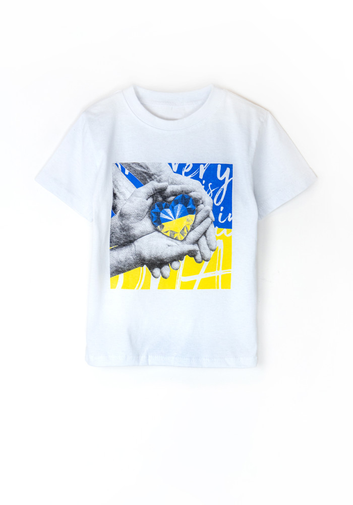 Стильна дитяча футболка білого кольору з яскравим патріотичним принтом – ідеальний вибір для маленьких модників та маленьких патріотів.