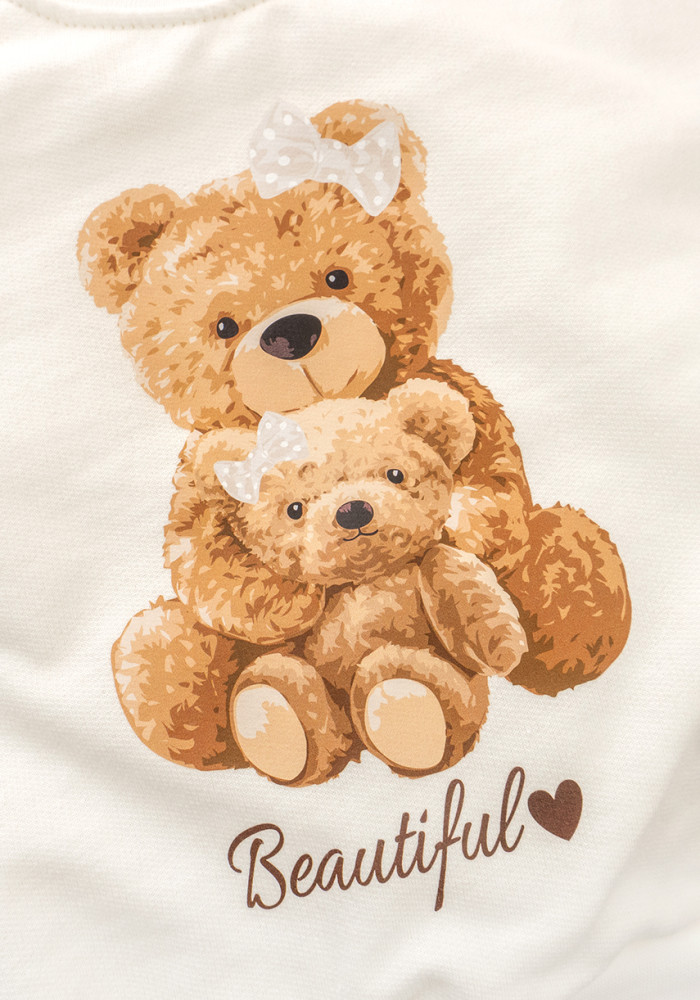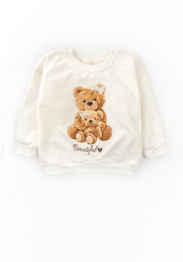 Теплий світшот для дівчинки виготовлений з м’якої двонитки з начосом (футер), що забезпечує комфорт у прохолодну пору року. Модель в універсальному білому кольорі з ніжним принтом у вигляді двох ведмедиків виглядає стильно та мило. Джемпер легко поєднується з джинсами, легінсами чи спідничками.