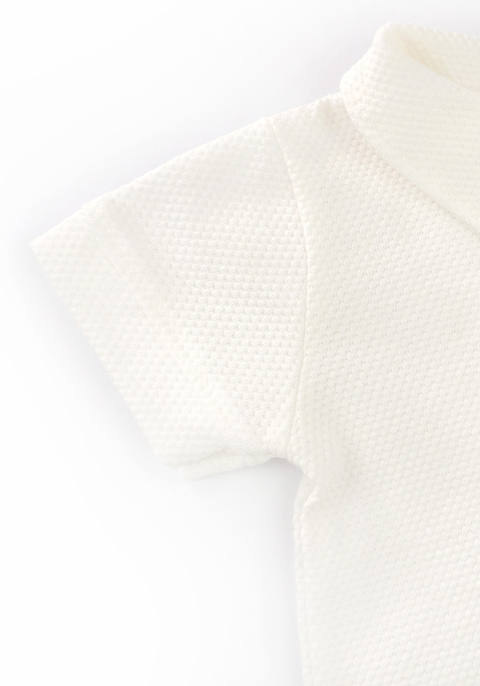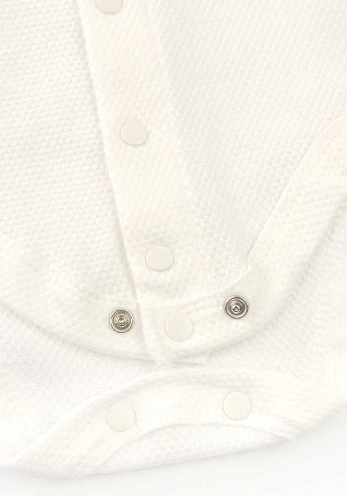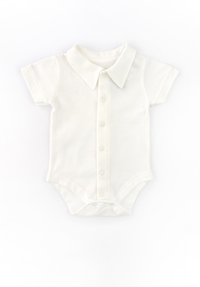An incredibly soft bodysuit for baby boys in the style of a classic shirt. Perfect for coming home from the hospital, baby's first photo shoot, or a family celebration. Made from natural kulir jacquard cotton — breathable, lightweight, and gentle on sensitive newborn skin. Snap closures at the bottom for quick diaper changes and buttons on the front for a touch of style. The “milky white” color is warm, timeless, and goes with any blanket or baby outfit.