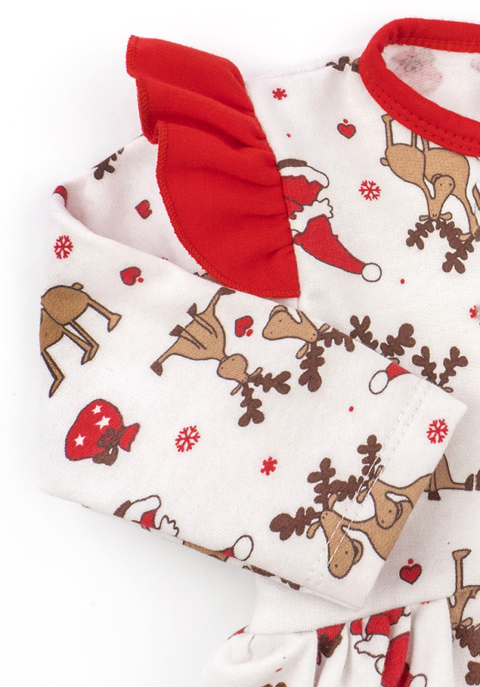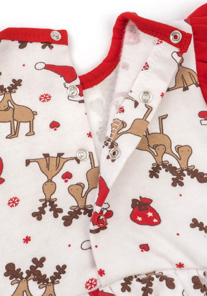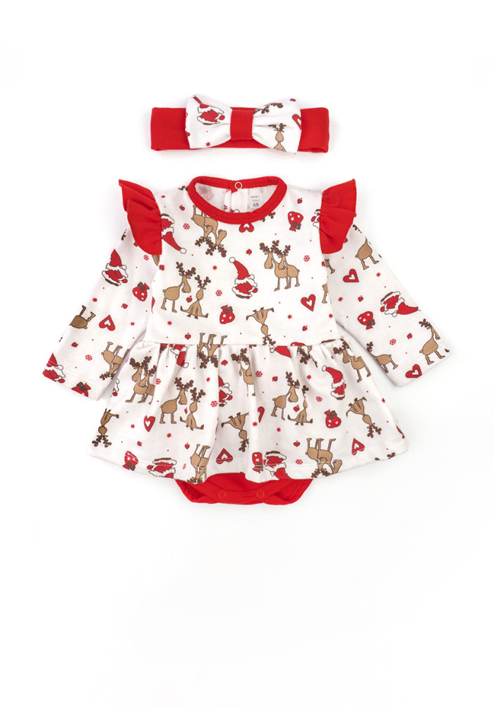 This adorable white baby bodysuit dress with reindeer print is a perfect choice for holidays and special occasions. Combining the comfort of a bodysuit with the charm of a dress, it makes your little princess shine in every photo.
