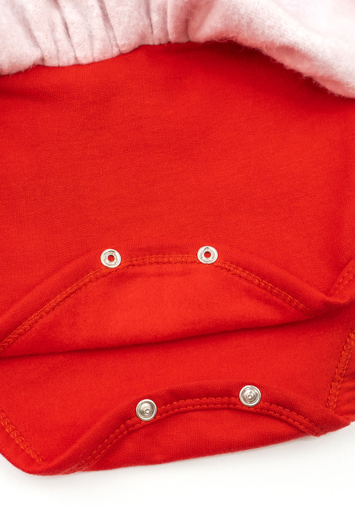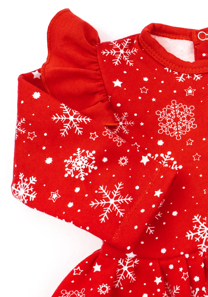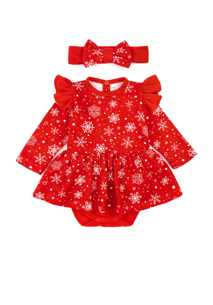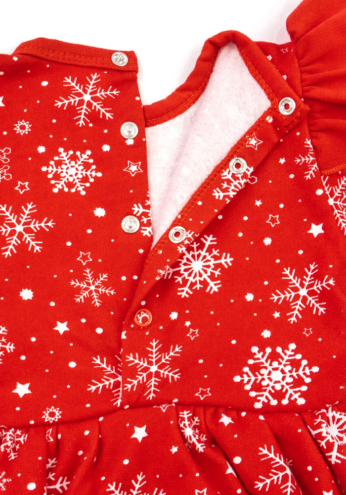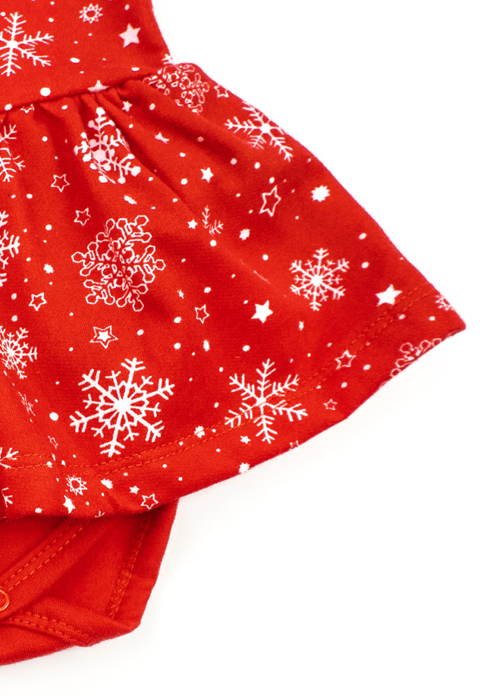 This adorable Christmas bodysuit dress for baby girls in bright red with snowflake print is perfect for holiday photos, family gatherings, and winter celebrations. It combines the softness of a bodysuit with the elegance of a dress, keeping your little one warm and stylish.