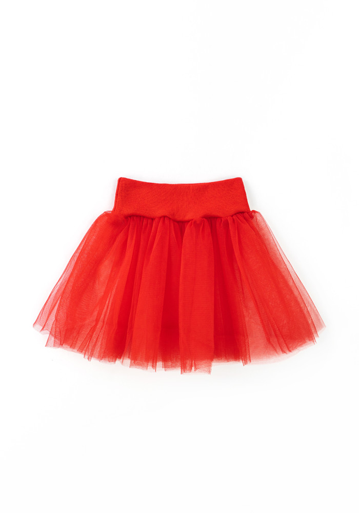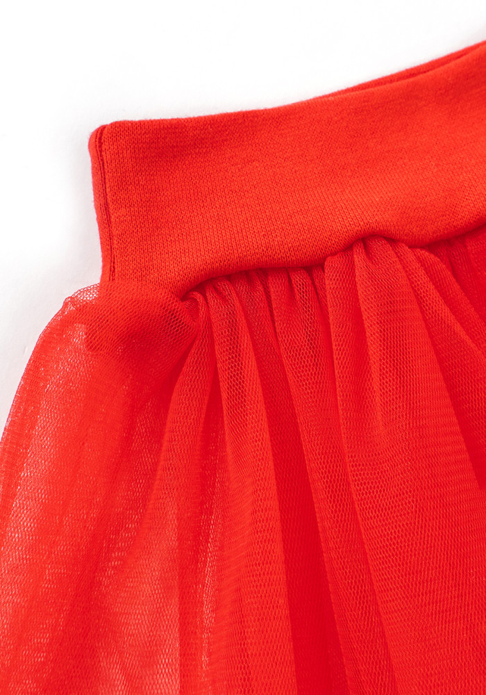 A vibrant red tulle skirt completes the look, adding volume and a holiday feel.