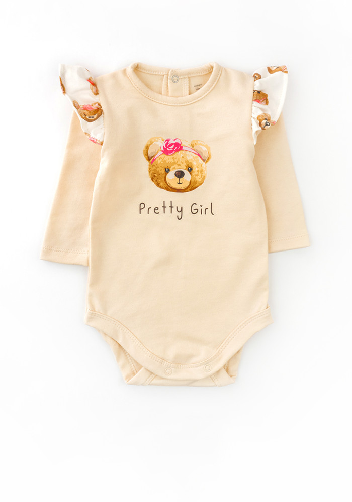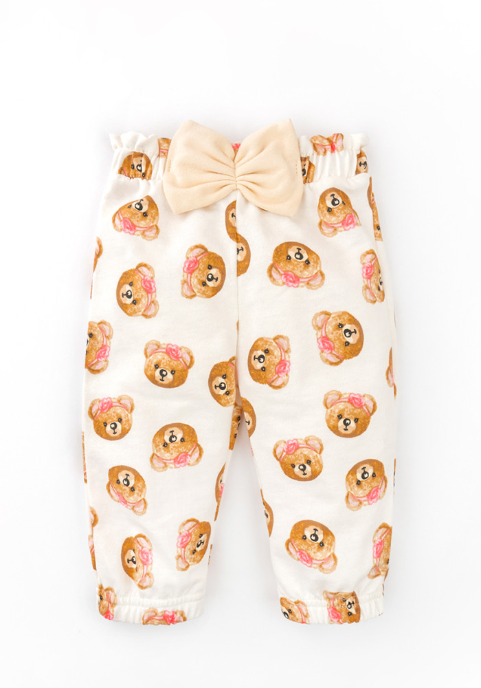 Warm Beige Baby Girl Set: Bodysuit, Pants & Headband with Bear Print