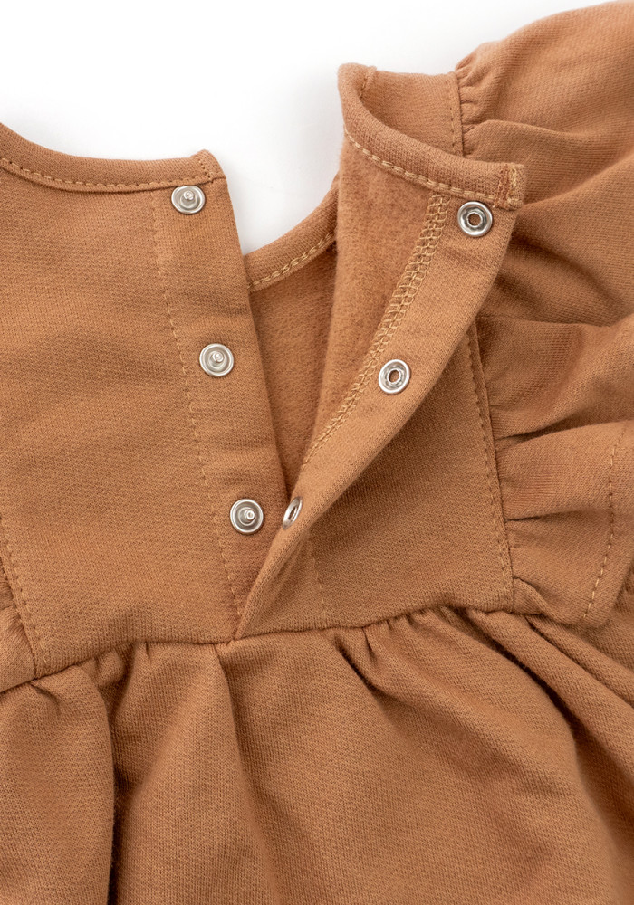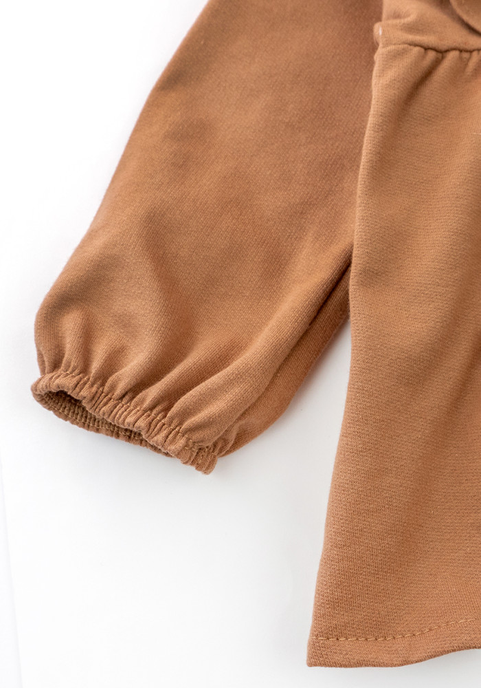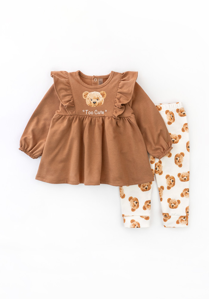 This adorable Girl Bears outfit for girls includes a brown tunic with long puffed sleeves and frill details, and matching white pants with a cute bear print.
