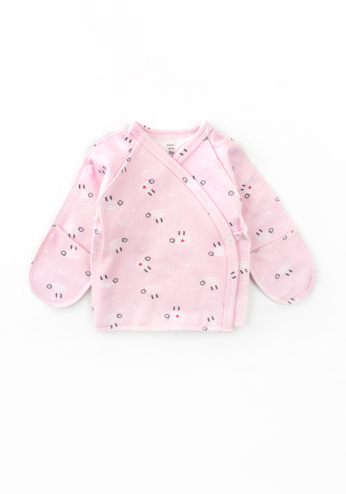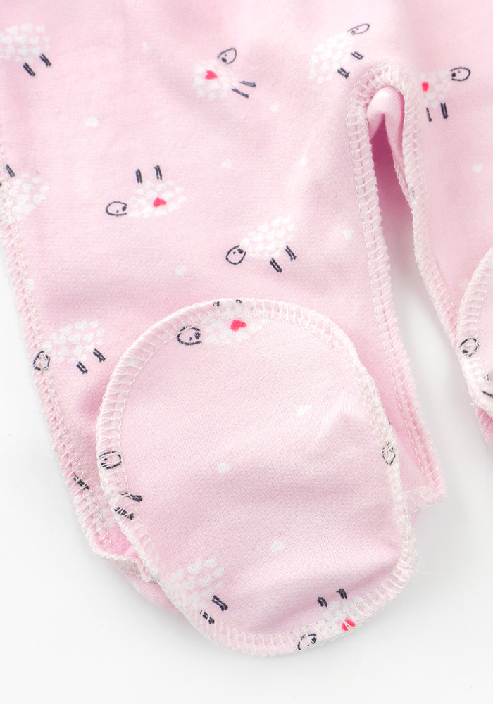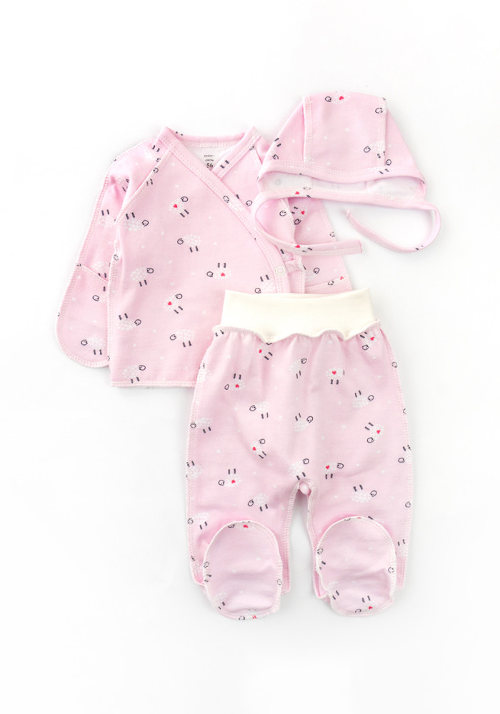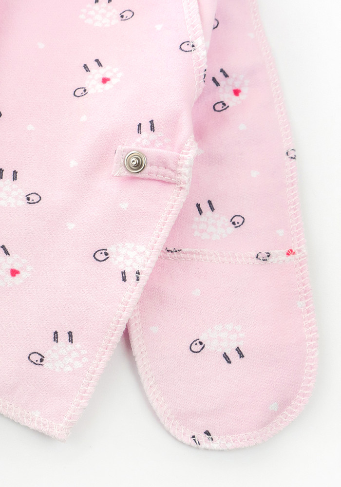 Designed in a soft pink color with adorable sheep print — perfect for baby girls. Made from 100% natural cotton, breathable, warm, and hypoallergenic. Ideal as a going-home outfit or for the first days at home.