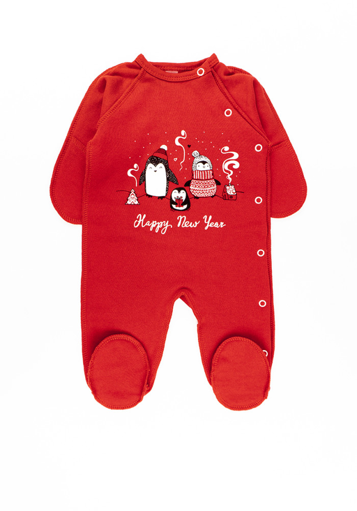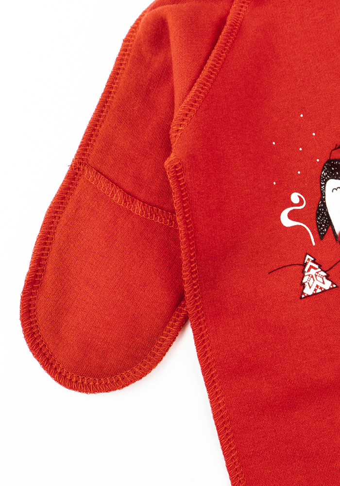This red baby romper with a cute penguin Christmas print is perfect for your little one’s first winter celebrations. Thoughtfully designed for maximum comfort: outer seams protect sensitive skin, built-in scratch mittens keep hands safe, closed feet ensure warmth, and snap buttons make dressing quick and easy.