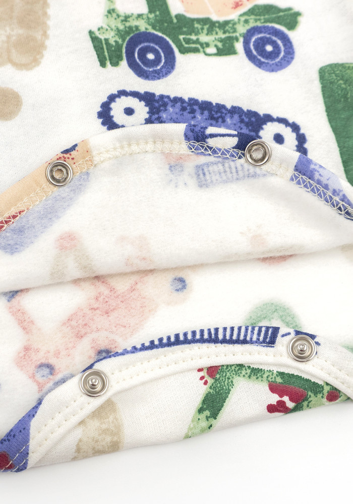 Боді має зручну застібку на плечі та між ніжками, що полегшує перевдягання малюка. Білий колір і яскравий принт з екскаваторами точно сподобається як дитині, так і батькам.