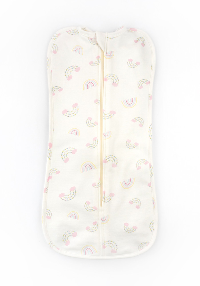 Утеплена пелюшка-кокон білого кольору з ніжним принтом у вигляді веселок — ідеальний вибір для дівчинки в прохолодну пору року.