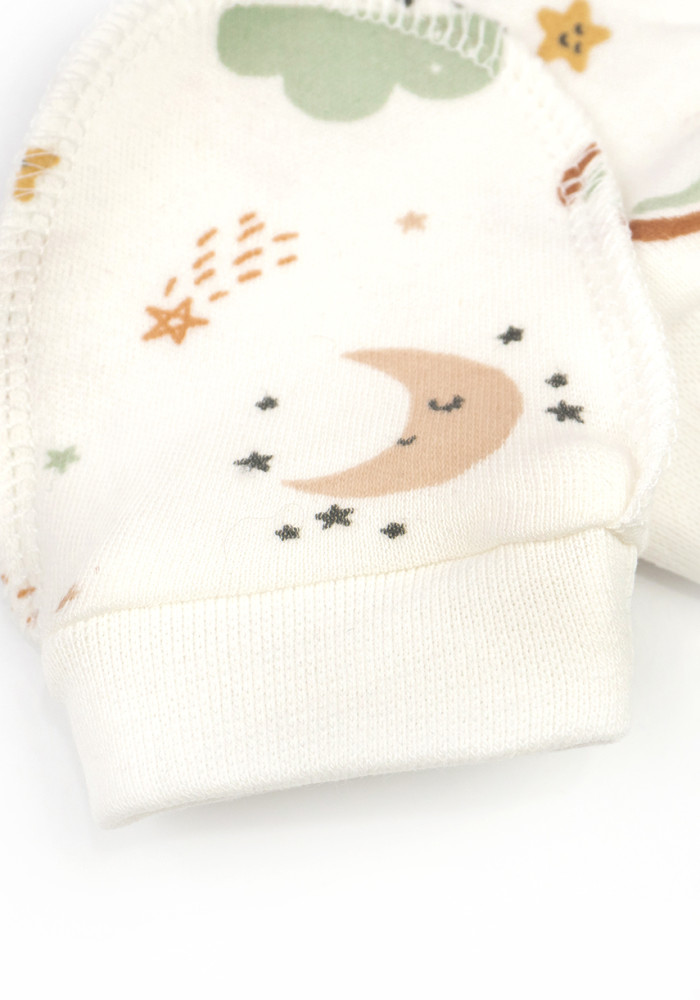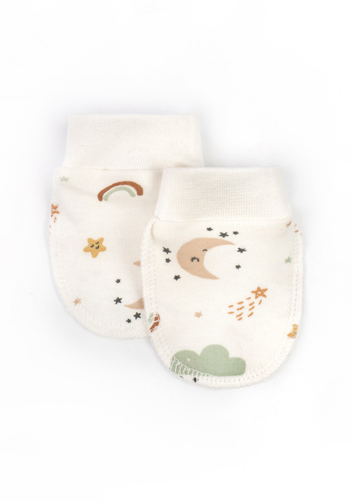 Модель виконана у молочному кольорі з милим принтом у вигляді місяців. Нейтральне забарвлення дозволяє використовувати царапки для немовлят як для хлопчиків, так і для дівчаток. Вони легко поєднуються з боді, чоловічками та іншими елементами дитячого одягу.