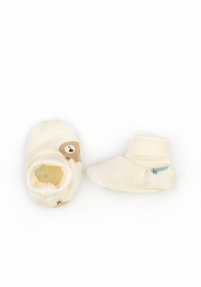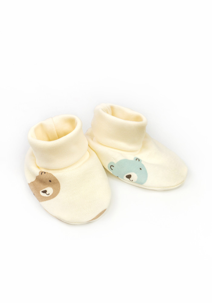 Модель виконана в універсальному молочному кольорі з милими мордочками ведмедиків, що робить пінетки стильними та привабливими як для хлопчиків, так і для дівчаток.