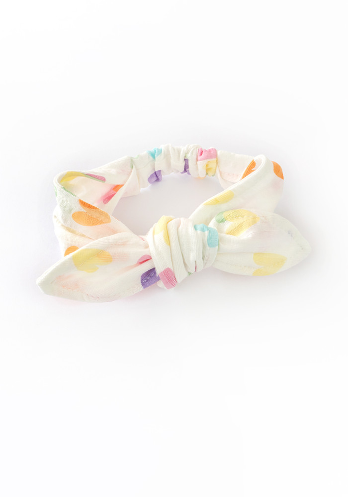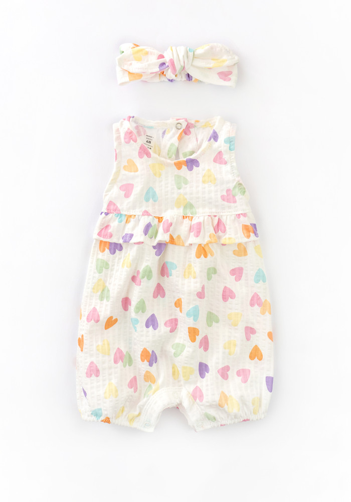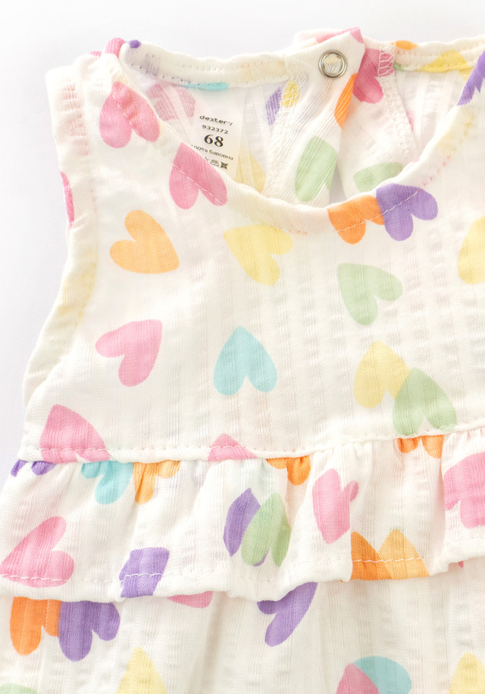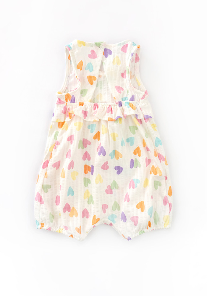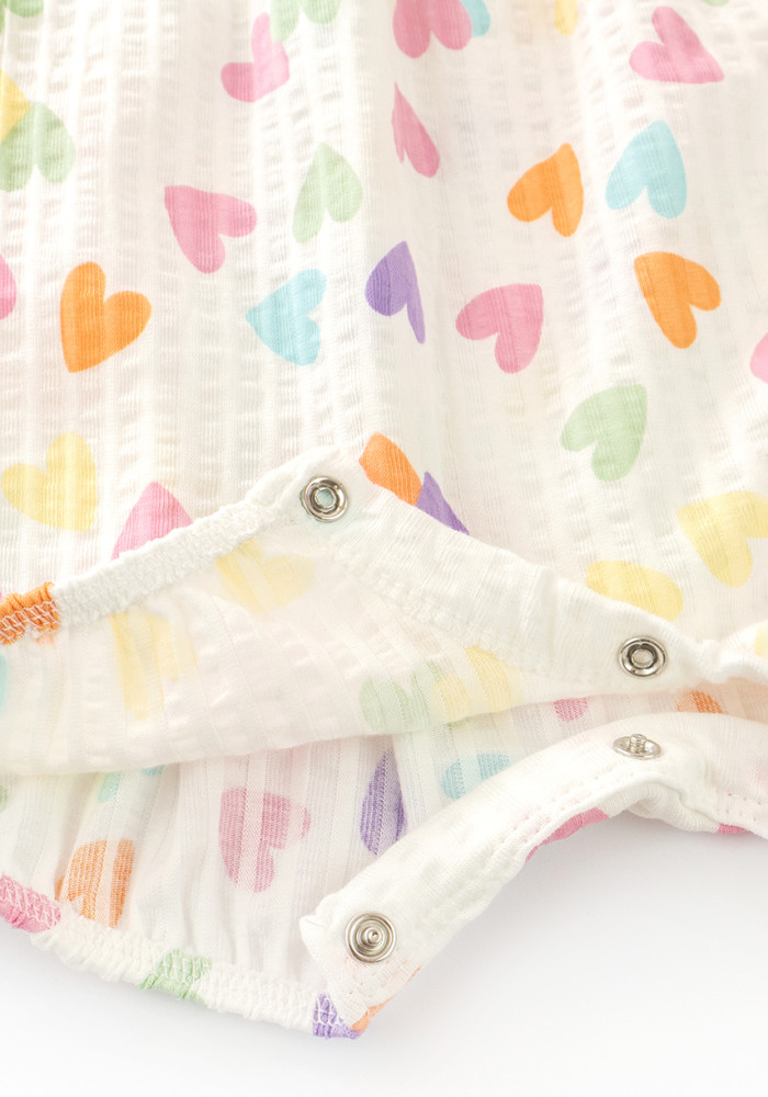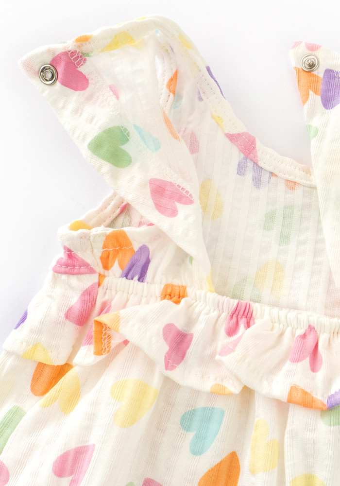 М’який відтінок молочного кольору гармонійно доповнюється яскравим принтом із сердечками, створюючи милий та сучасний образ для немовлят і малюків.