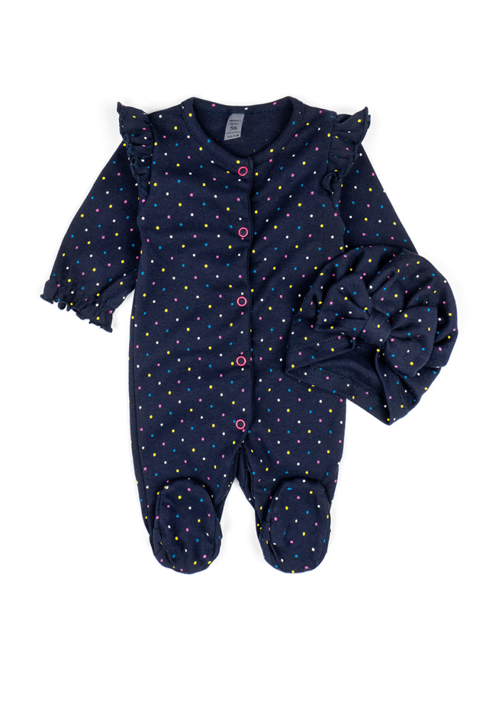 Легкий ошатний чоловічок для дівчинки з натуральної рибани — ідеальний вибір для теплої пори року. Тонка, дихаюча бавовняна тканина дарує комфорт, не парить та підходить для ніжної шкіри немовляти. Темно-синє забарвлення з яскравим горошком виглядає стильно, а крильця та об’ємний рукав додають ніжності й святкового вигляду.