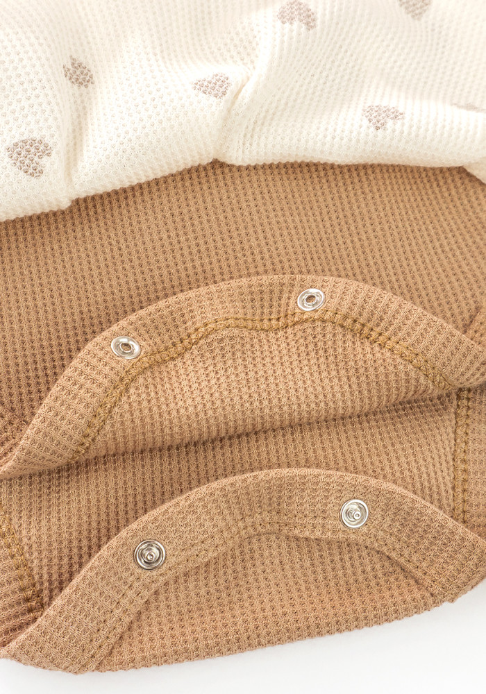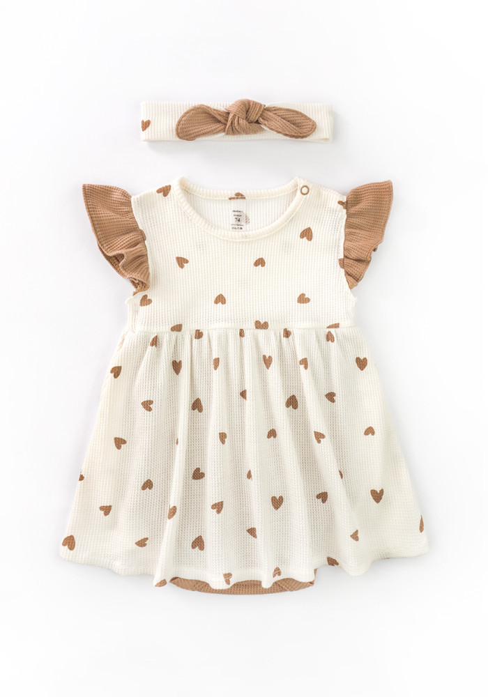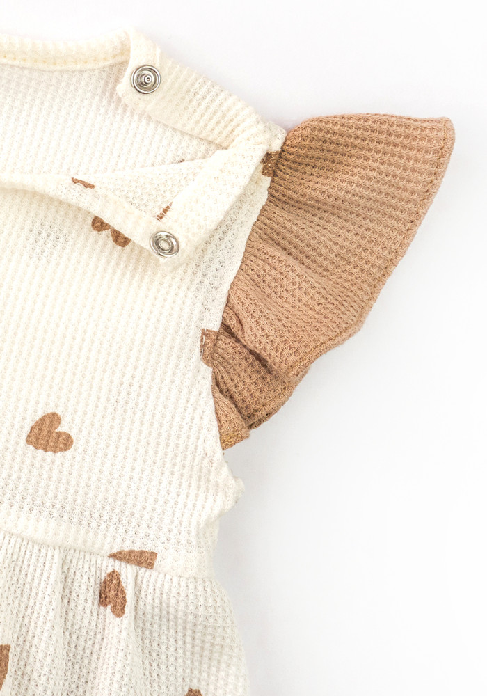 Urocza body-sukienka dla dziewczynki z miękkiej, waflowej bawełny. Kolorystyka: jednolity beż i kremowy materiał z nadrukiem beżowych serduszek.