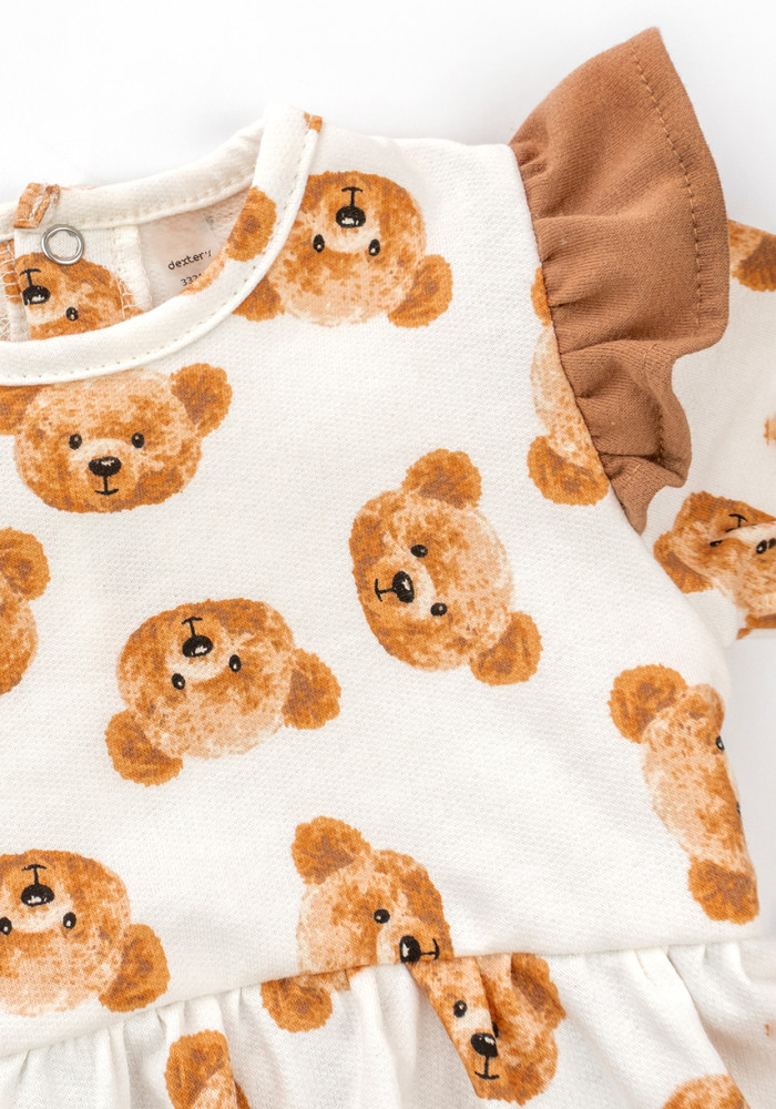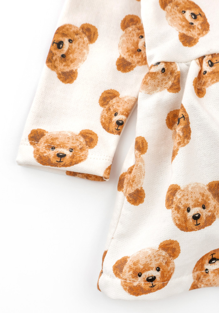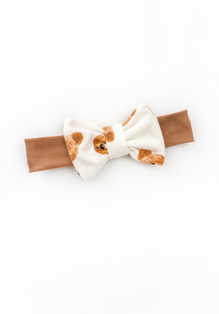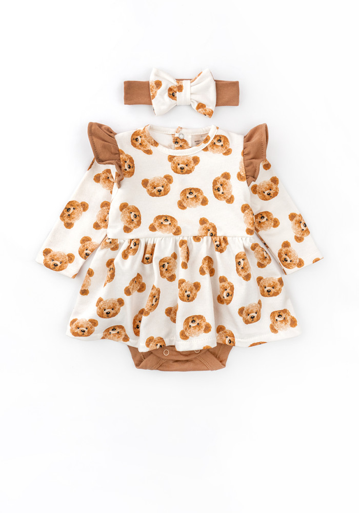W komplecie znajduje się również opaska z kokardką. Uroczy nadruk w misie dodaje zestawowi dziecięcego uroku. Naturalna bawełna nie uczula i dobrze znosi pranie.