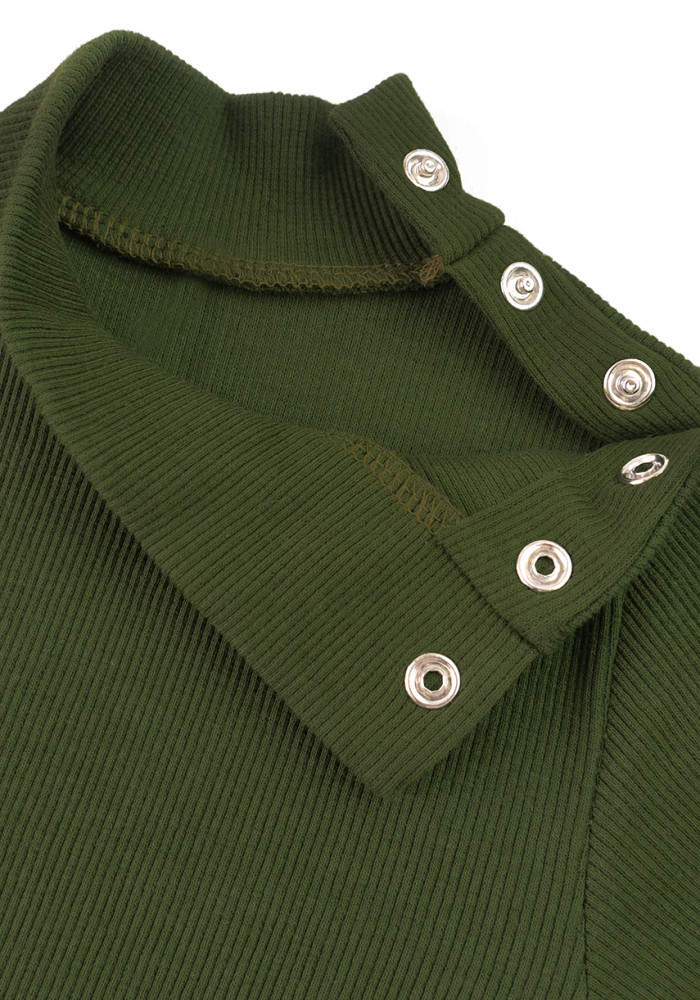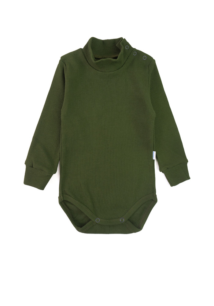 Body-golf z prążkowanego materiału w kolorze khaki to praktyczny wybór do codziennego ubioru dziecka. Długi rękaw i miękka tkanina zapewniają komfort i ciepło, a zatrzaski przy dekolcie ułatwiają ubieranie. Zabudowane plecy chronią przed chłodem.