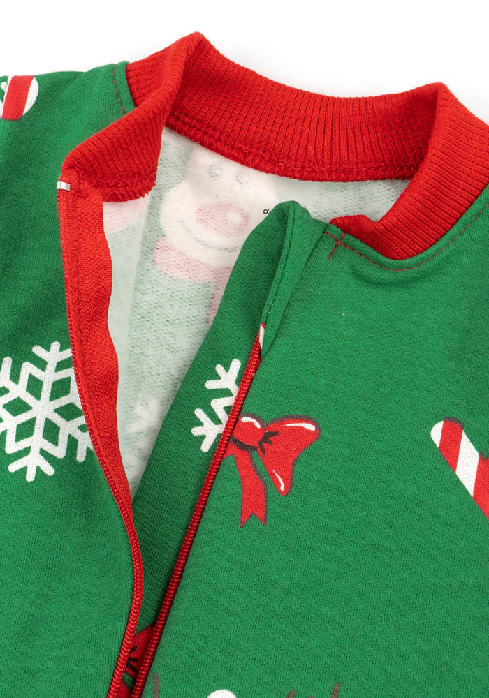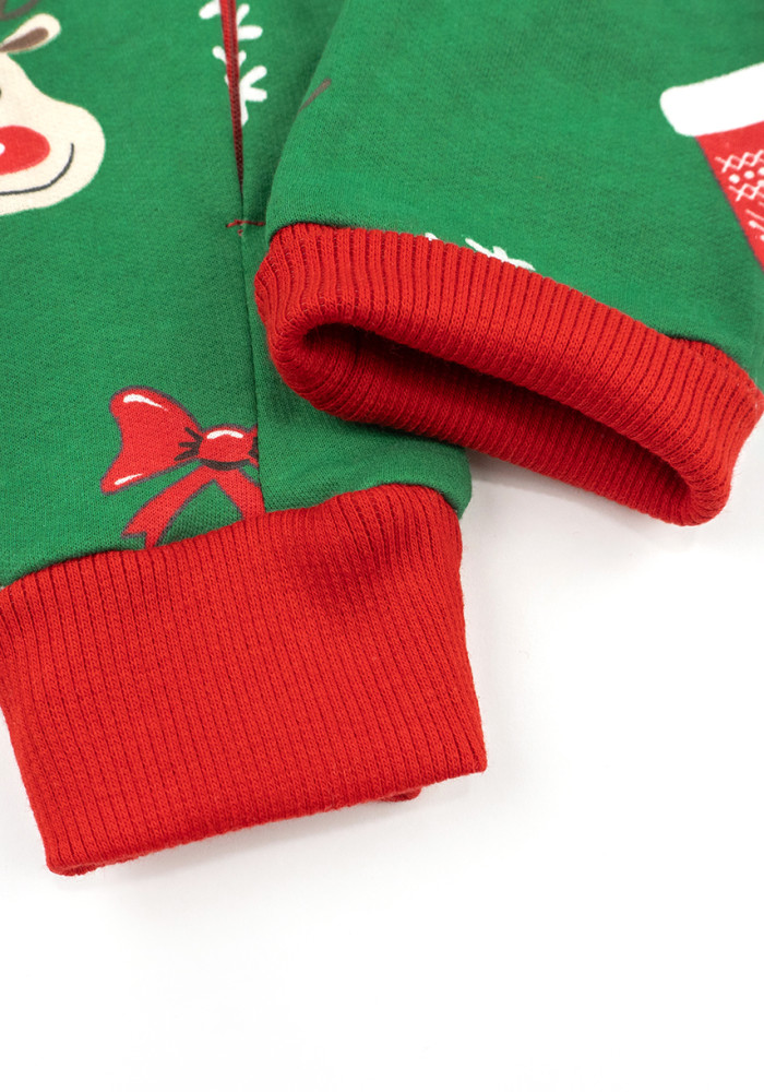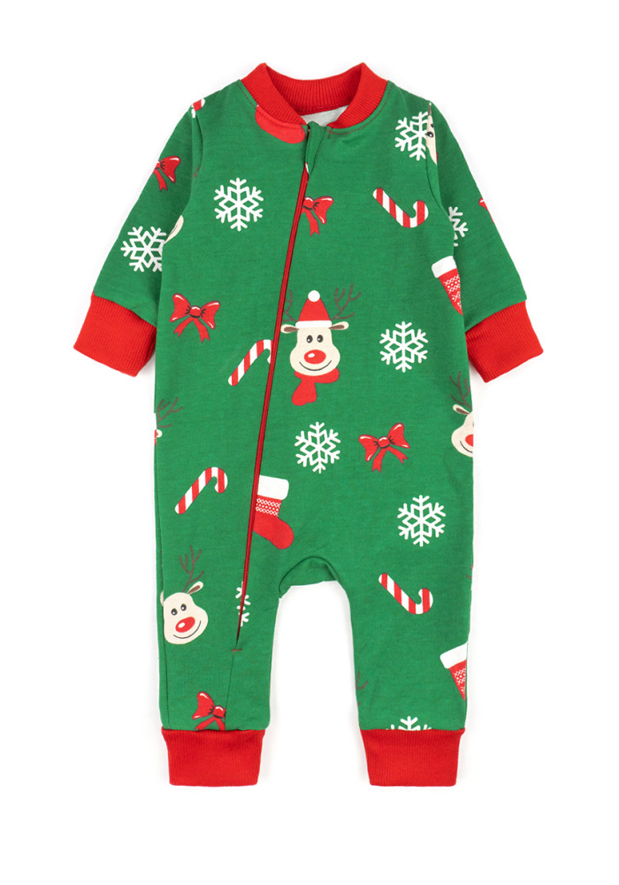 Rampers ma zielone tło z motywem reniferów oraz czerwone mankiety, co tworzy wyjątkowy, świąteczny wygląd. Miękki materiał sprawia, że kombinezon doskonale nadaje się zarówno do codziennego noszenia, jak i jako ciepła piżama.