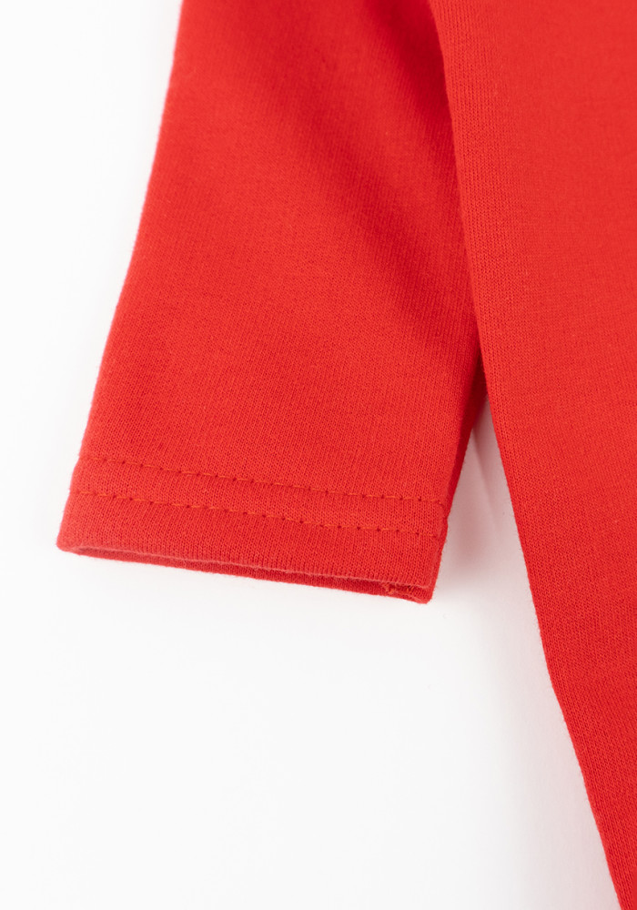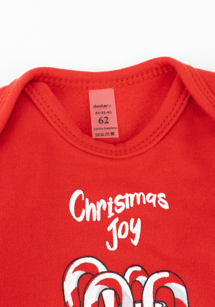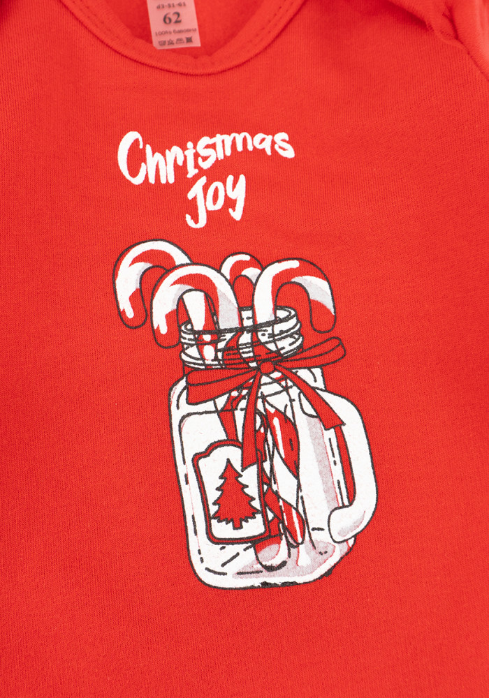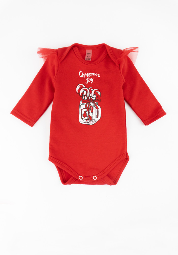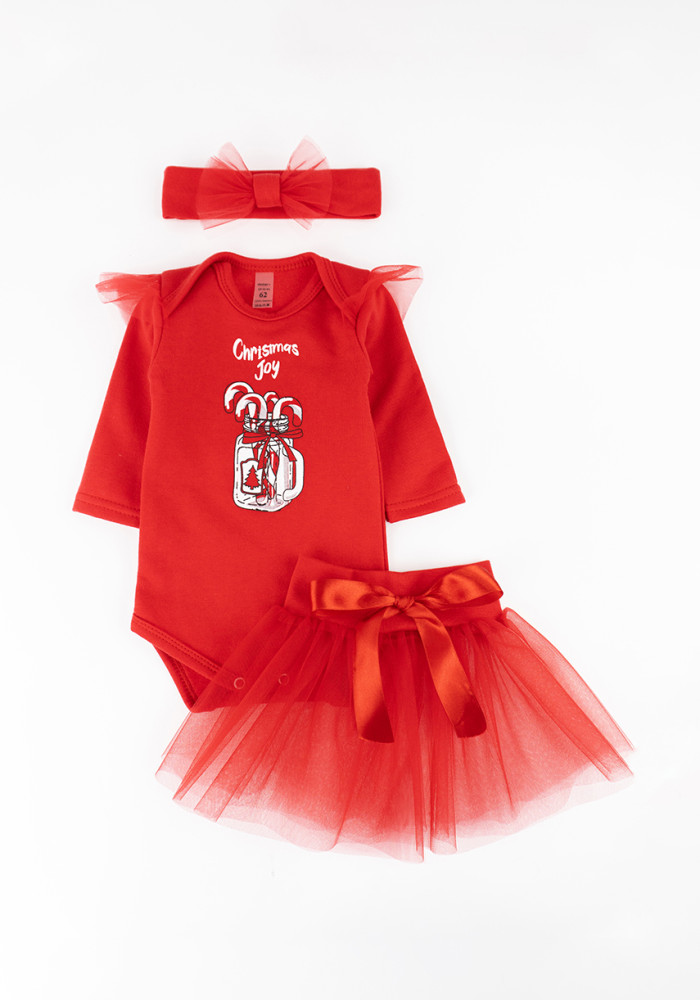 Zestaw zawiera ciepłe body z długim rękawem i nadrukiem w lizaki świąteczne, czerwoną tiulową spódniczkę oraz opaskę z kokardką.