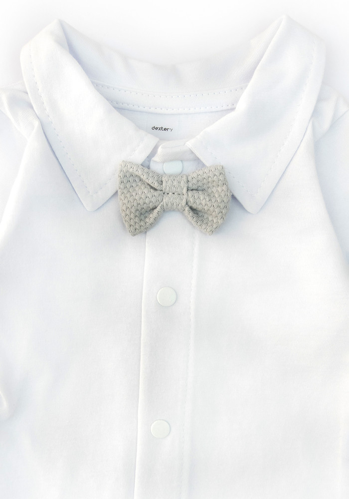 Stylowa muszka w kolorze szarym dopasowana do spodni