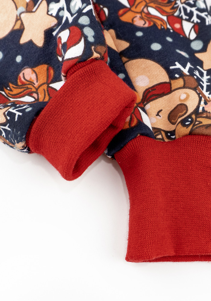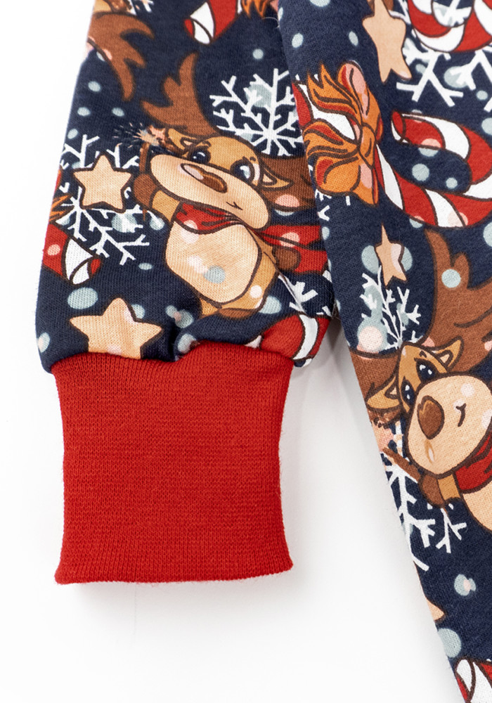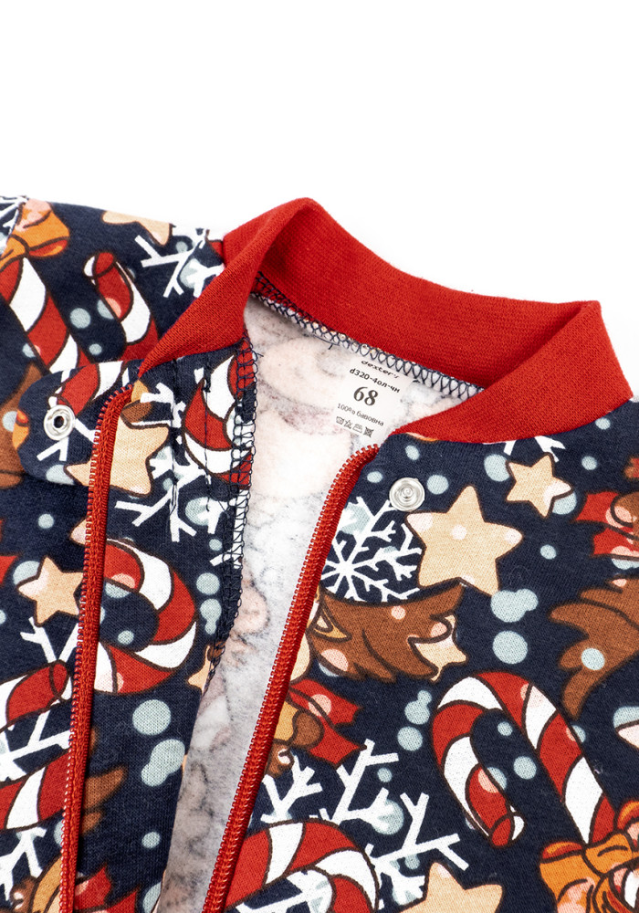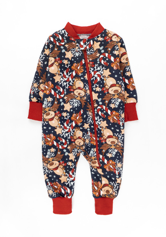 Детский комбинезон из трикотажа с начосом. Модель имеет новогодний и праздничный рисунок с оленями.