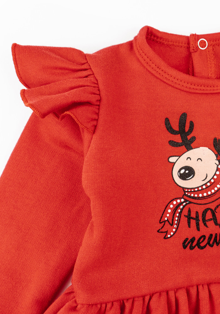 Красное боди-платье с милым принтом оленёнка — отличный выбор для новогодних фотосессий, домашнего праздника или в качестве подарка на зиму.