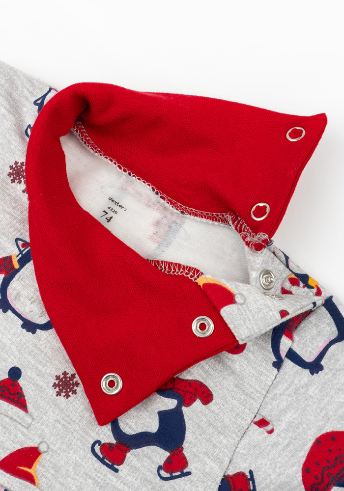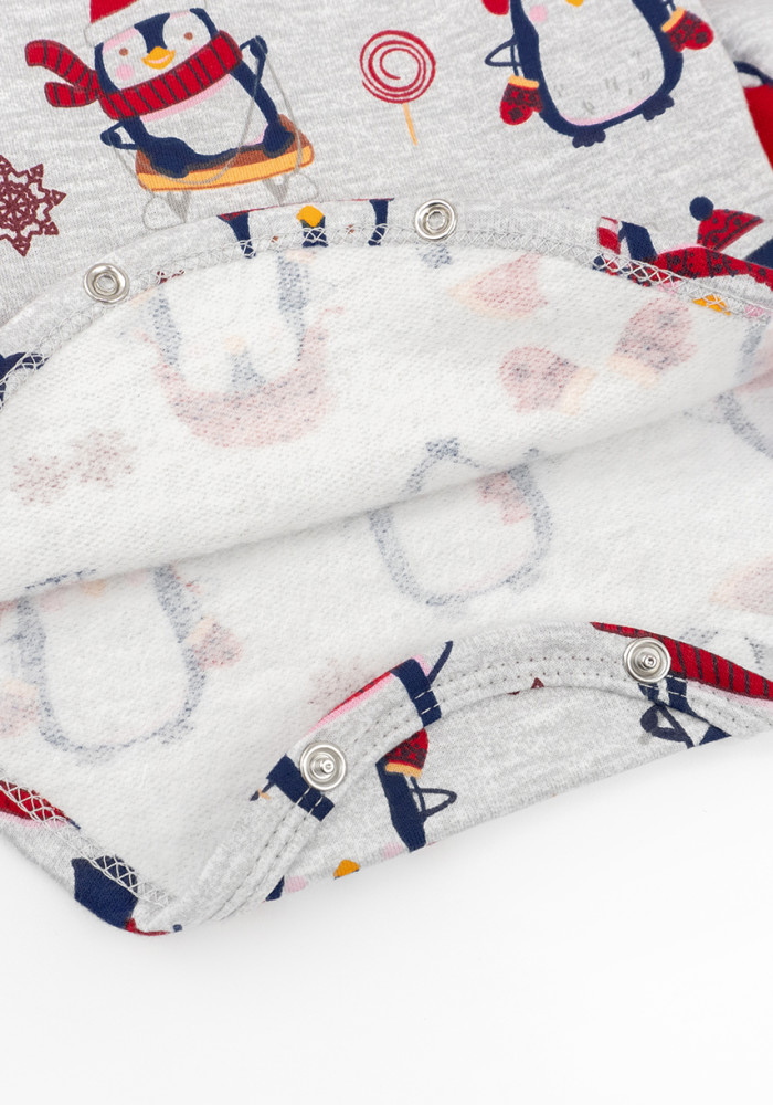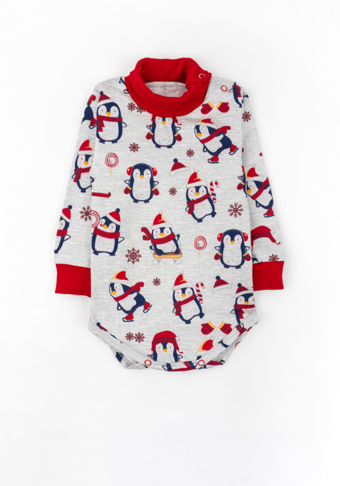 Детский бодик с рождественским принтом пингвинов. Бодик с длинным рукавом. Эта модель часто называется бодик-водолазка из-за высокого воротника, который закрывает шейку.