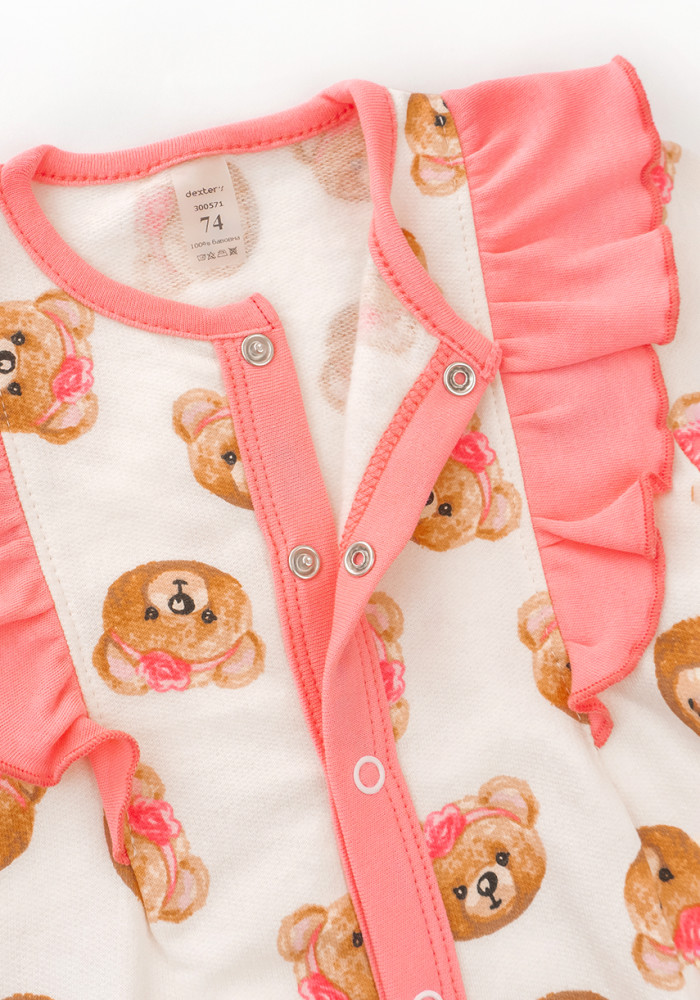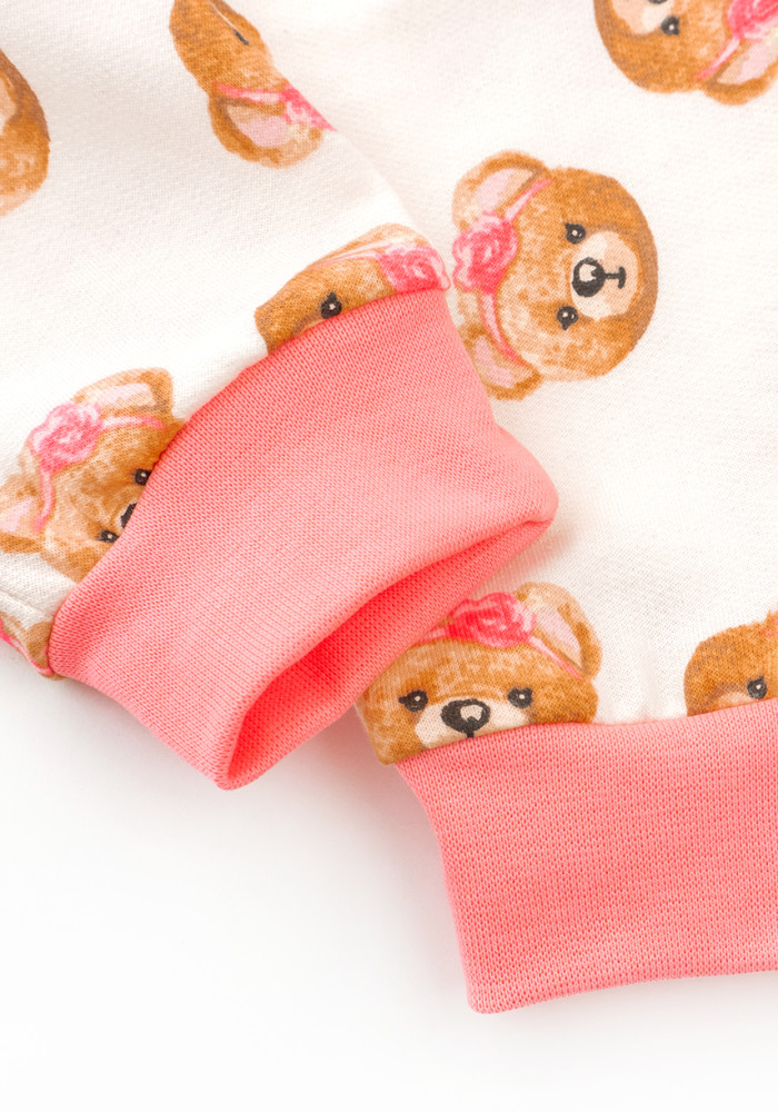 Очаровательный и тёплый комбинезон для девочки белого цвета с розовыми крылышками и манжетами. Изделие украшено милым принтом с мордочками медвежат, что придаёт образу нежность и стиль.