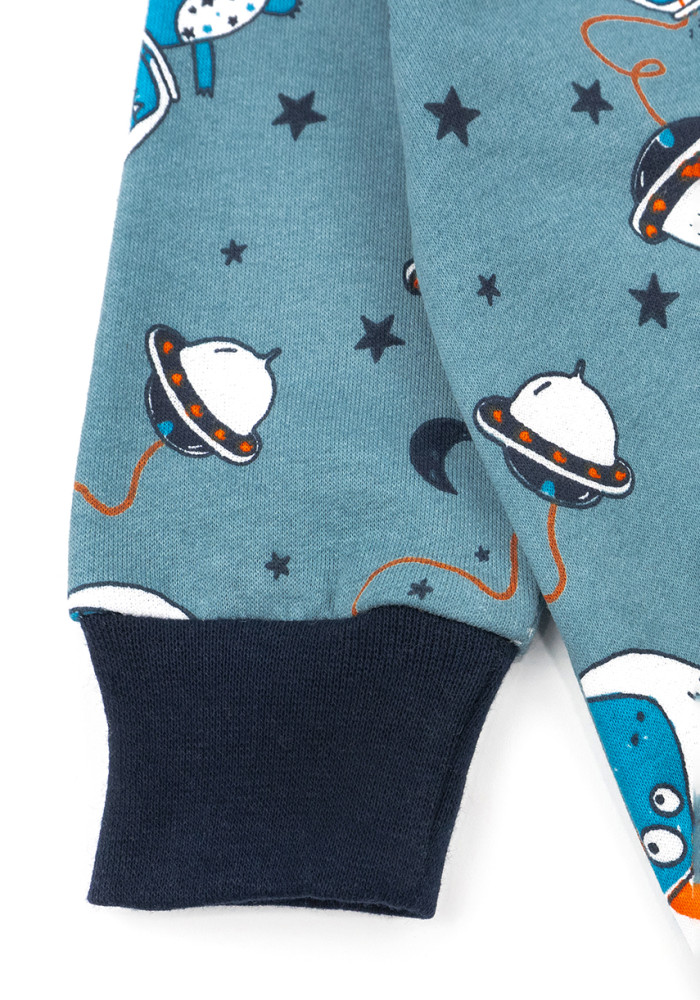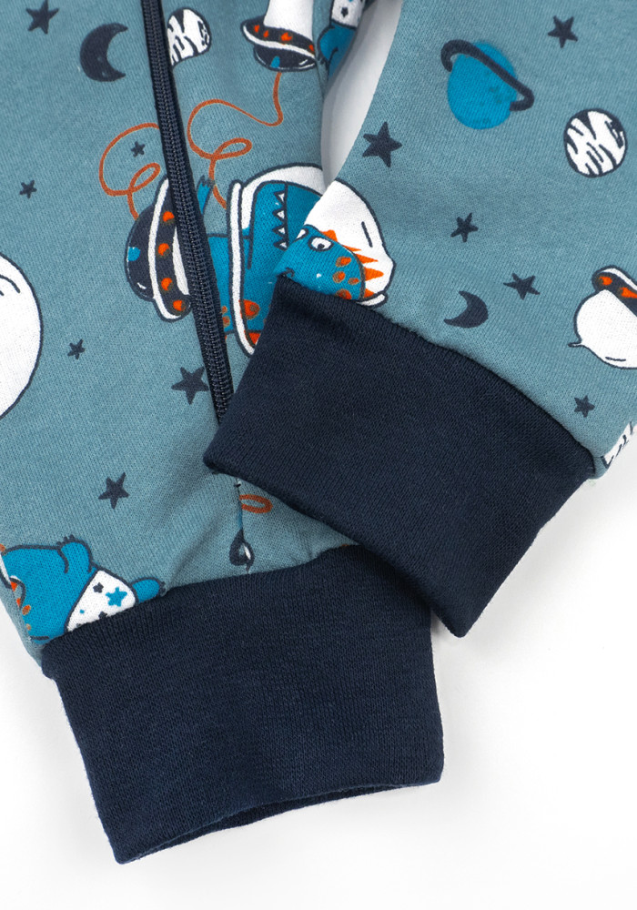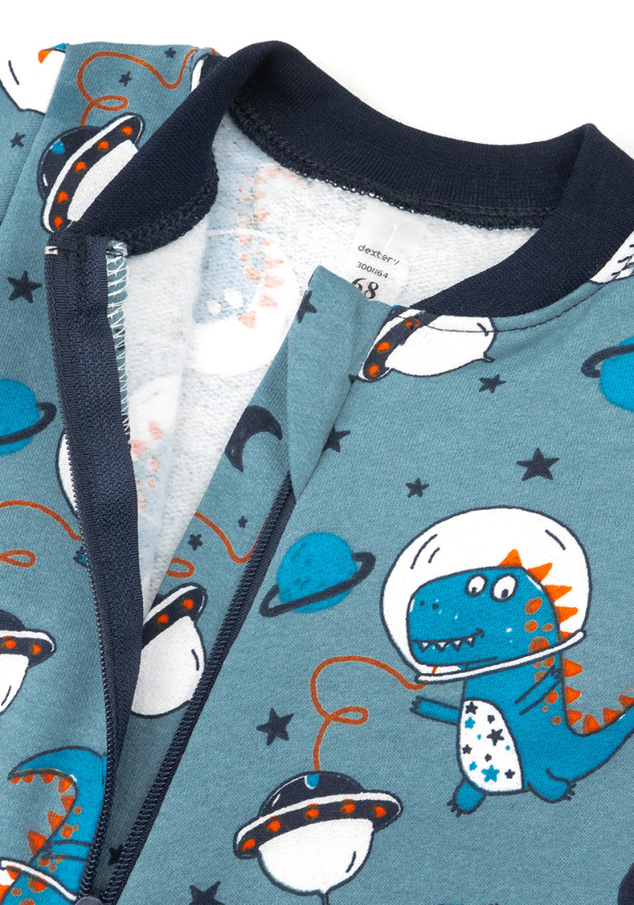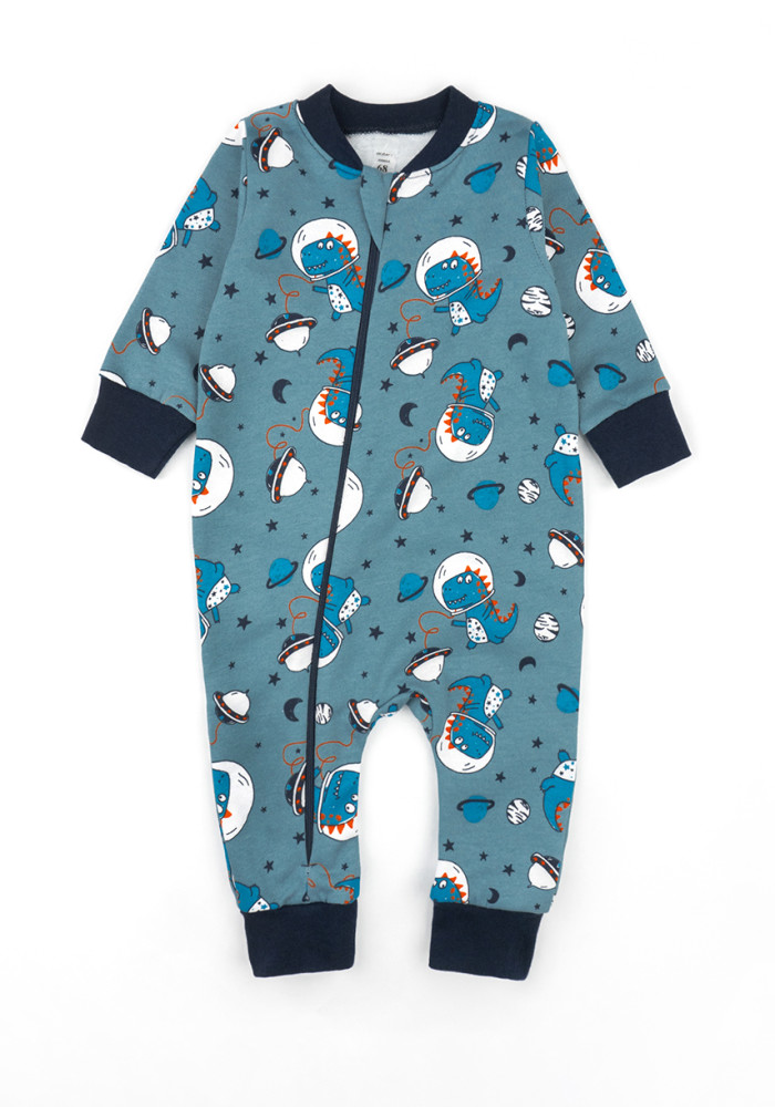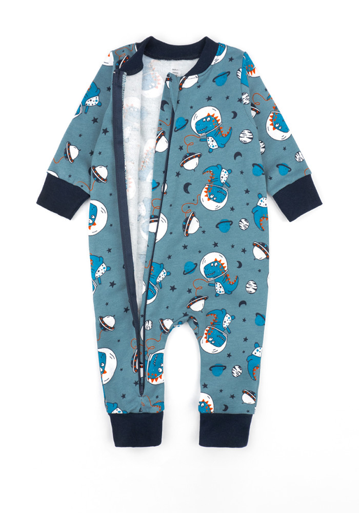 Яркий синий цвет с динозаврами делает этот детский комбинезон для мальчика стильным и привлекательным.