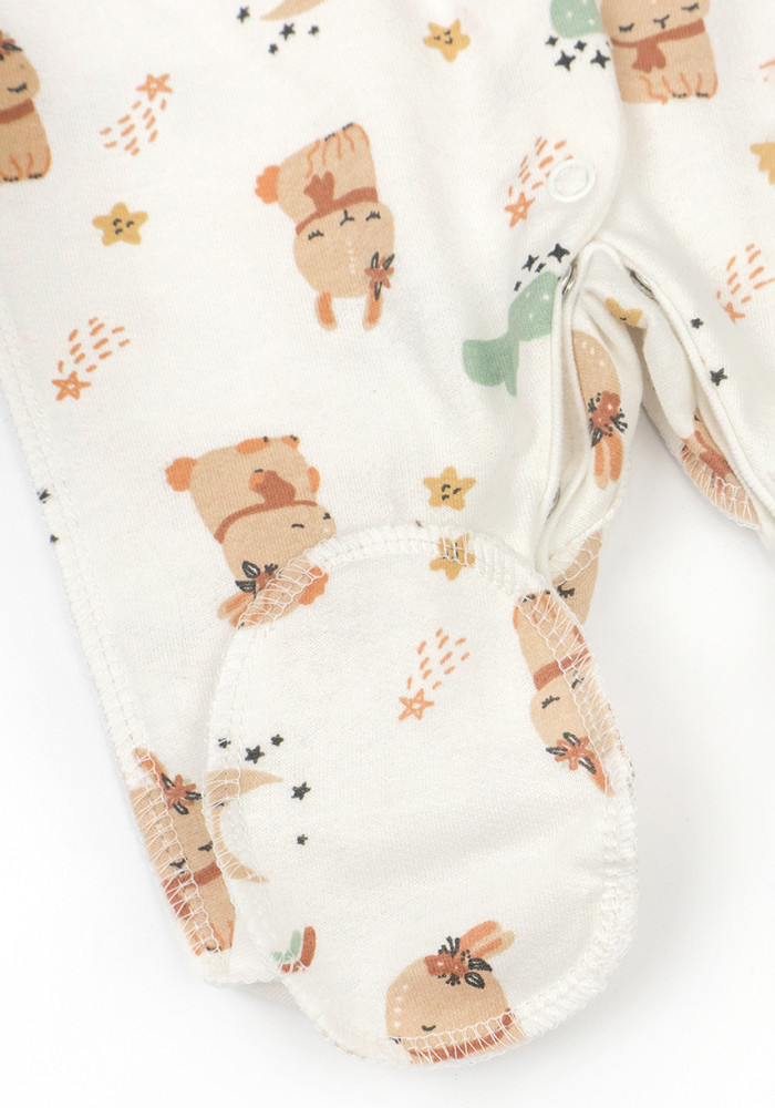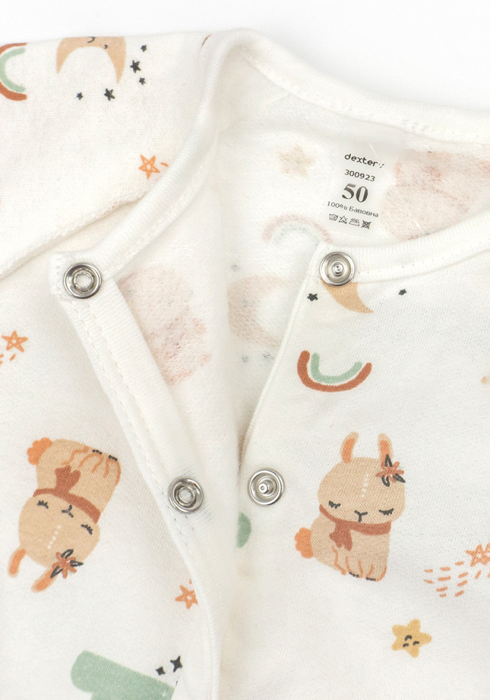 Нежный белый цвет с зайчатами подходит и мальчику, и девочке. Кнопки по всей длине упрощают переодевание и уход.