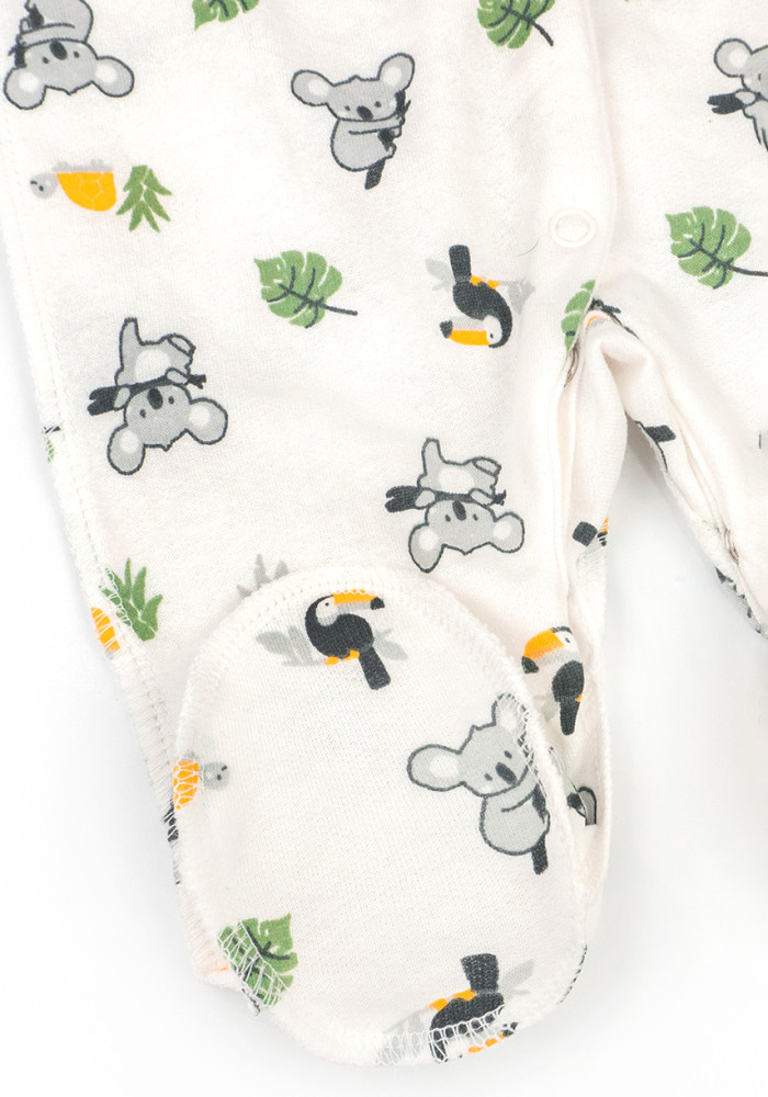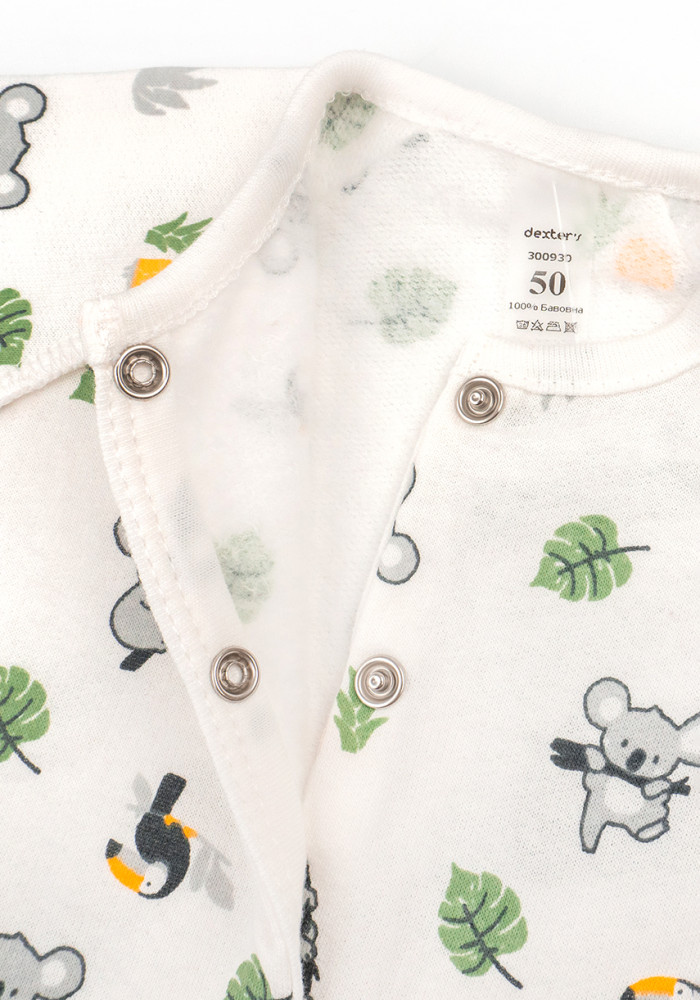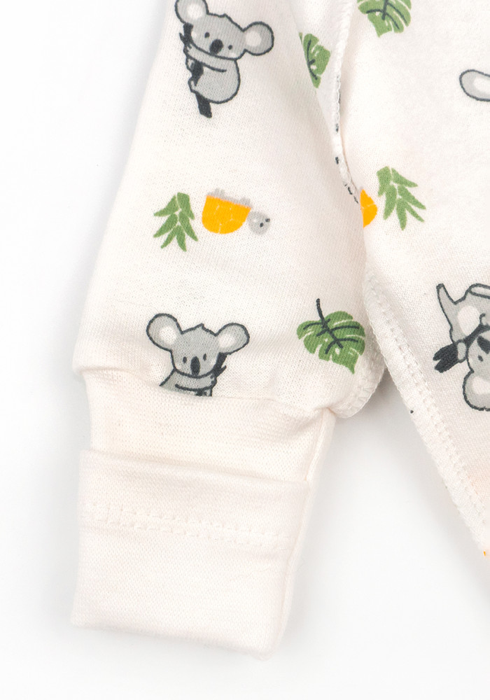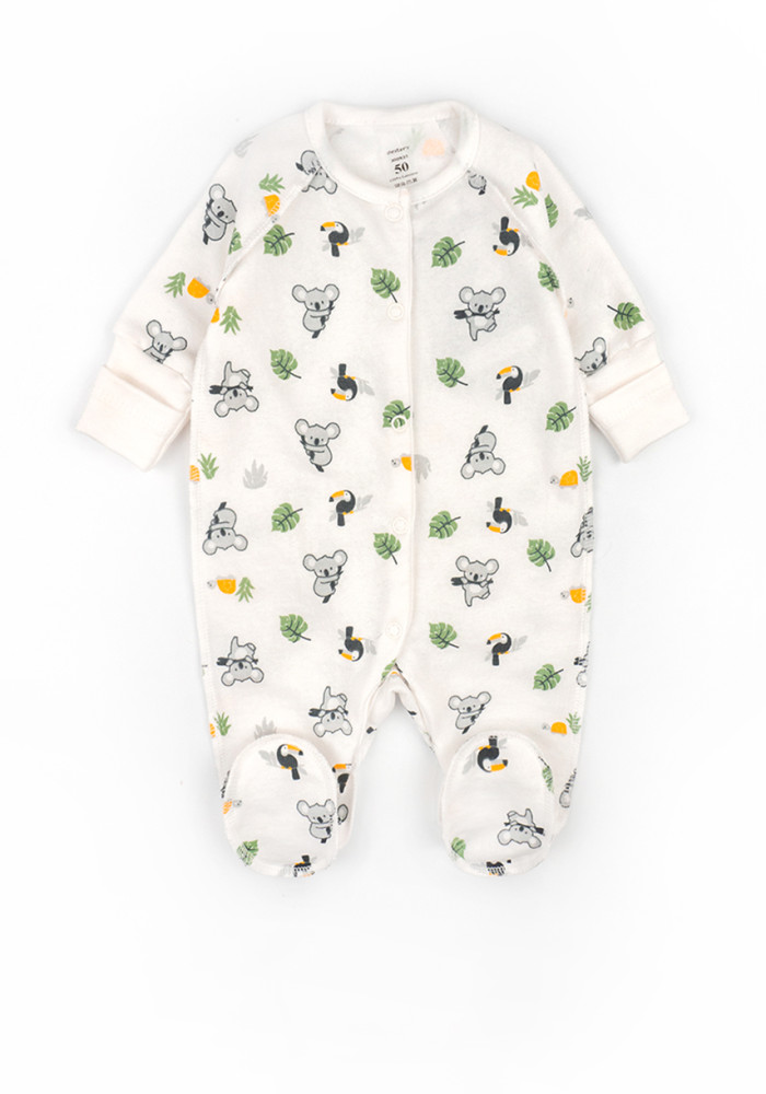 Комбинезон имеет нежный молочный цвет с коалами, универсальный для мальчиков и девочек. Кнопки по всей длине делают переодевание быстрым и удобным.