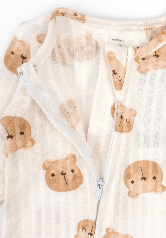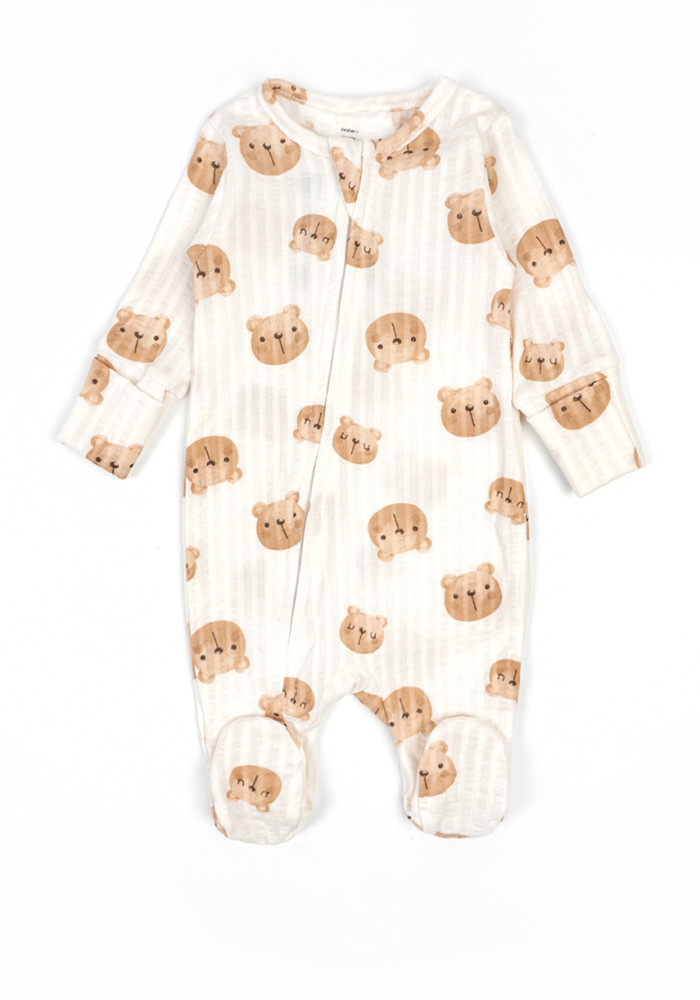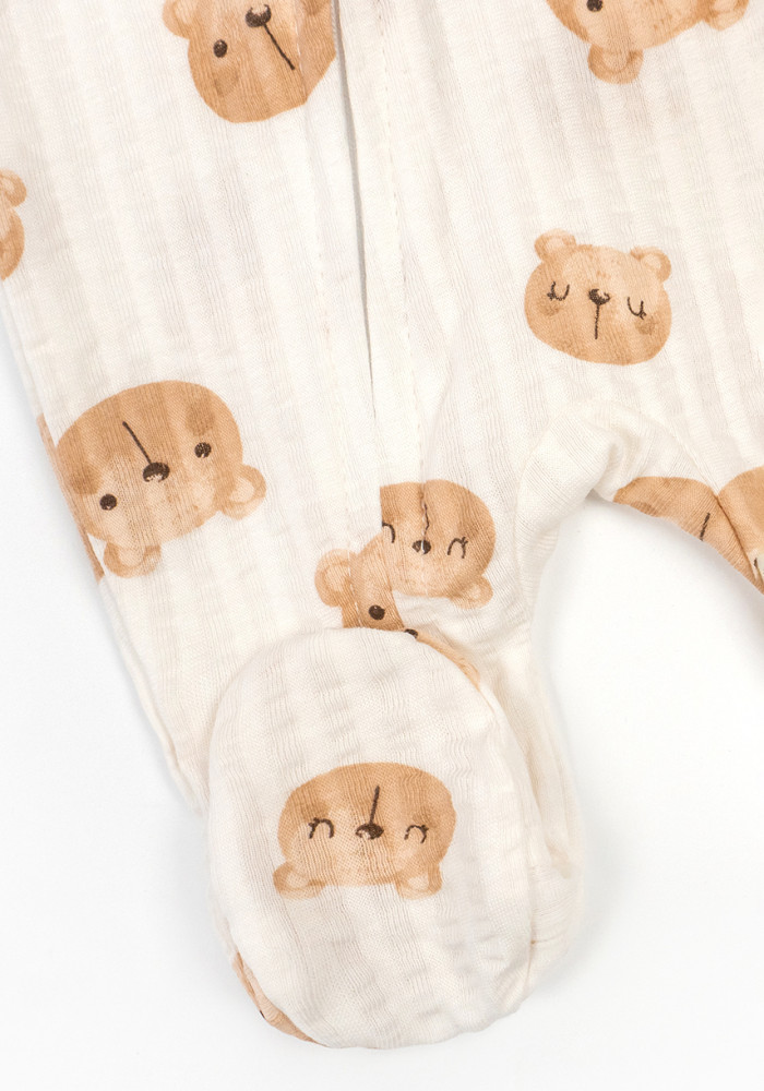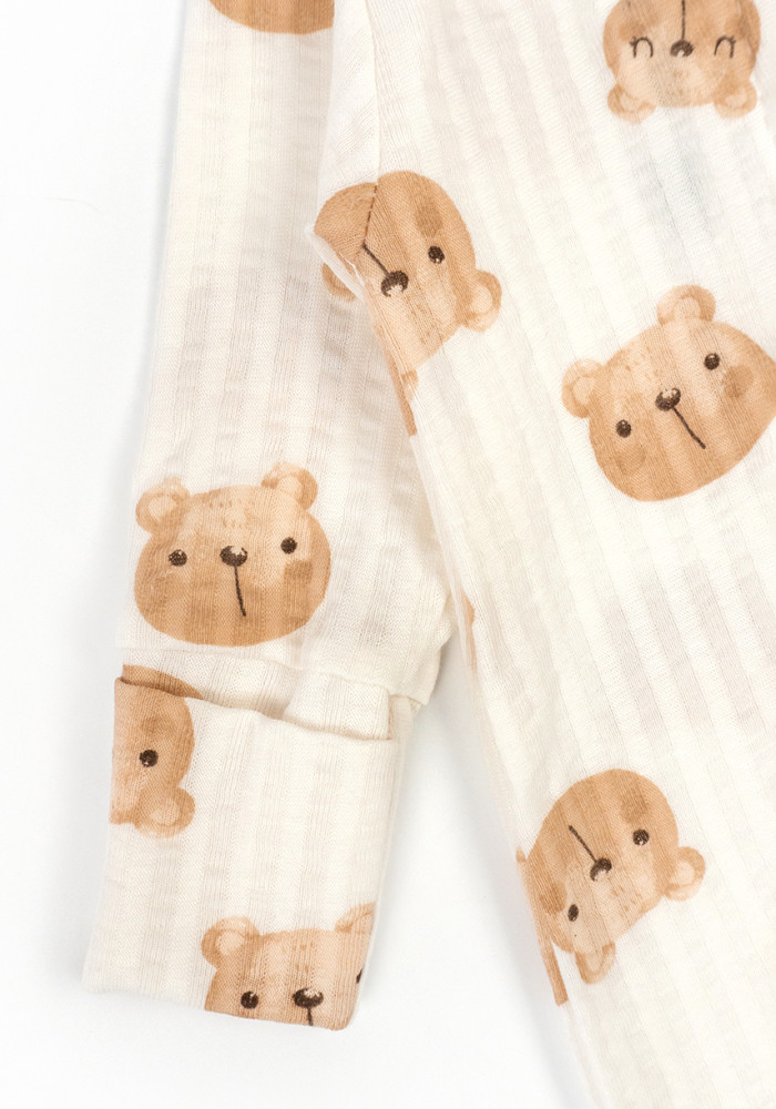 Комбинезон выполнен в молочном цвете с акварельными мордочками мишек. Подходит как для мальчиков, так и для девочек — отличный вариант подарка.