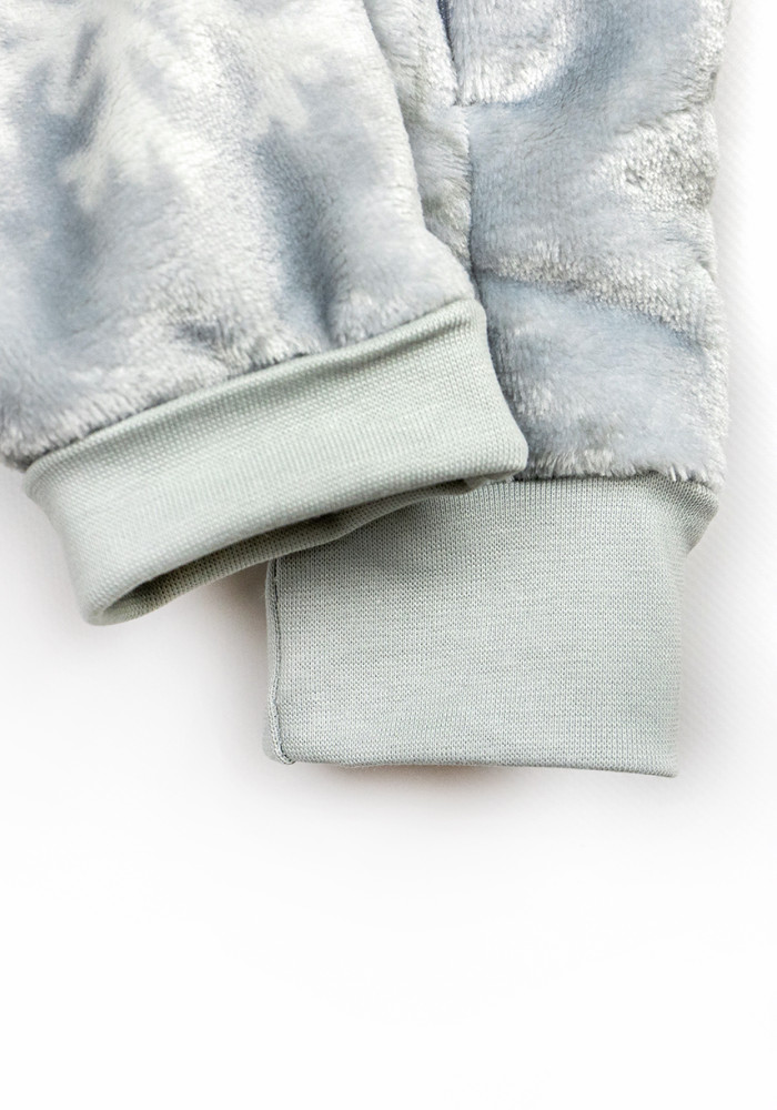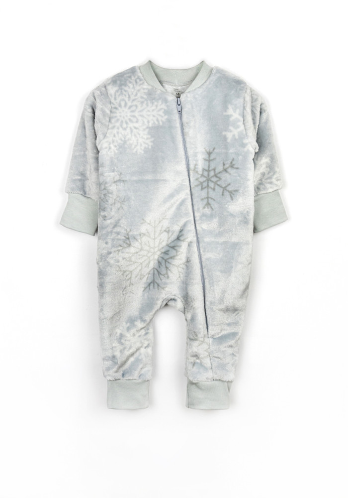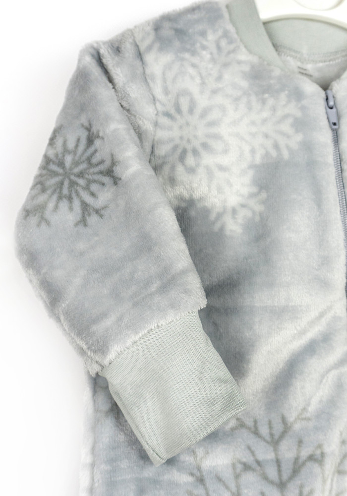 Детский ромпер на молнии выполнен из мягкой, теплой и приятной на ощупь плюшевой ткани велсофт. Украшен милым узором со снежинками. Модель с открытыми ножками, длинными рукавами и мягкими трикотажными манжетами для максимального комфорта малыша.